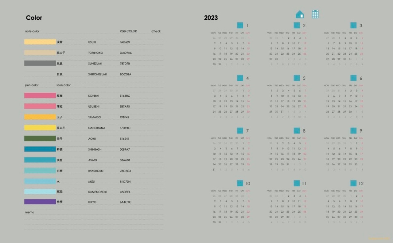 表紙+カレンダー(2023.01〜2023.12)1枚+年間スケジュール(2023.01〜2023.12)1枚+
