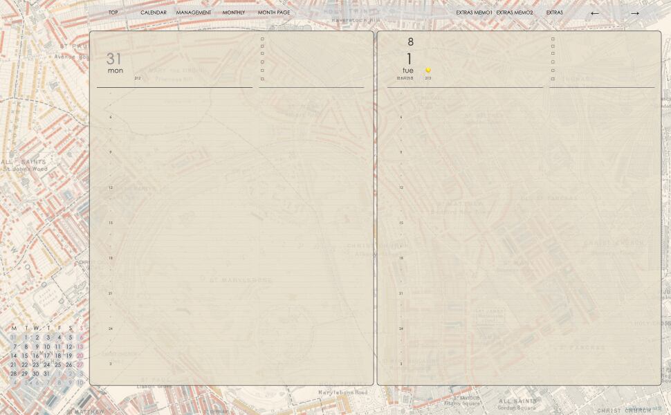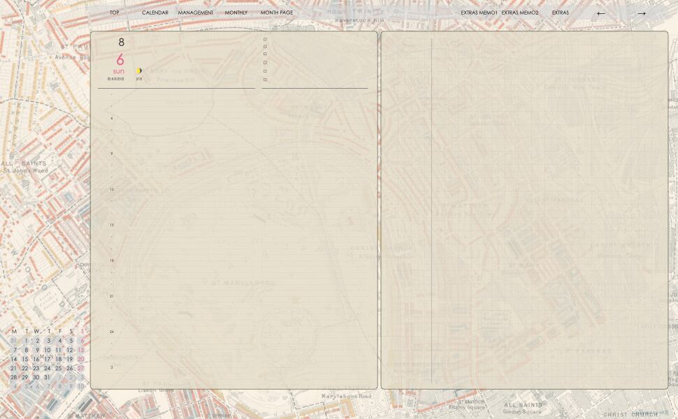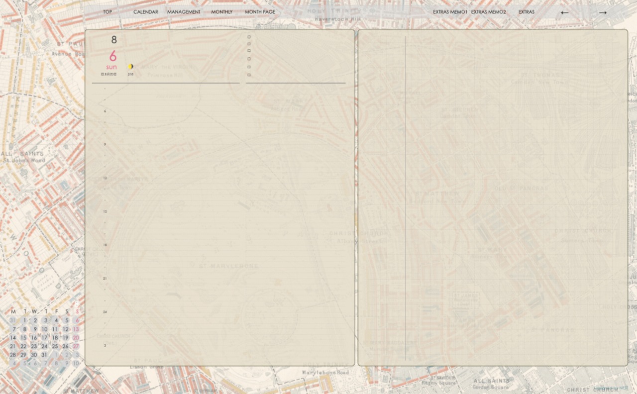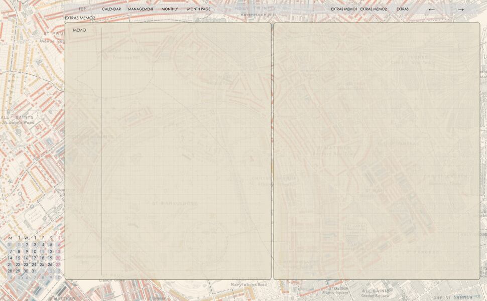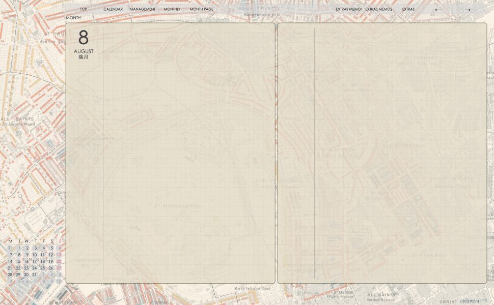 このデザインは表紙だけでなく 中身の手帖のページにも地図を透かしで入れています。