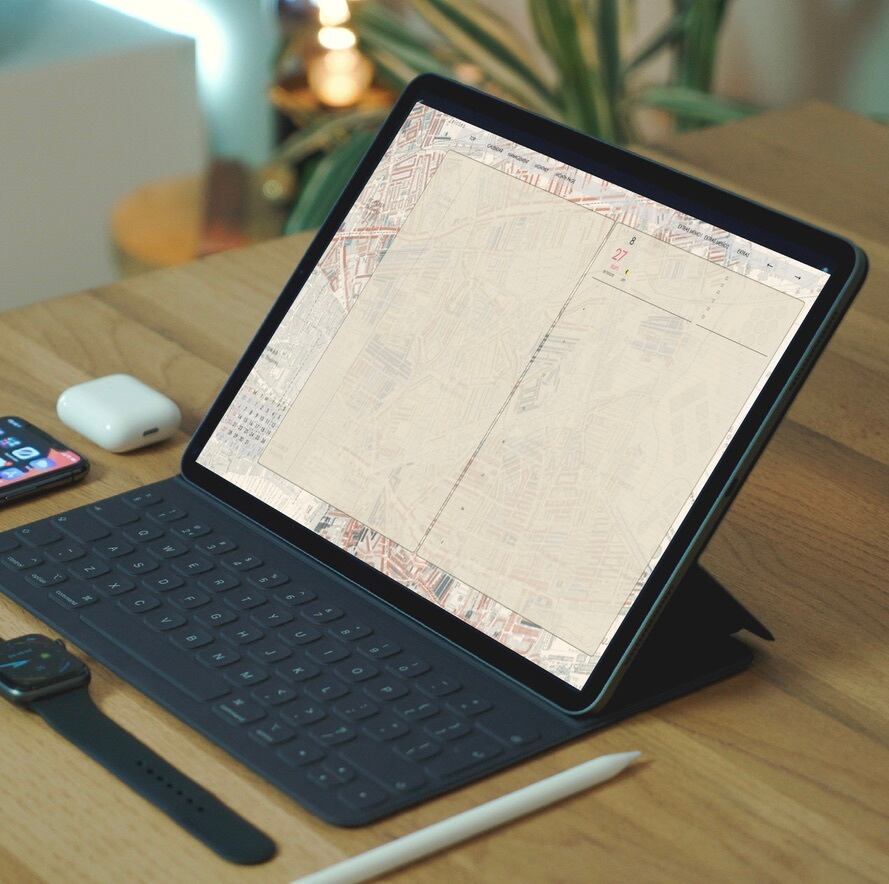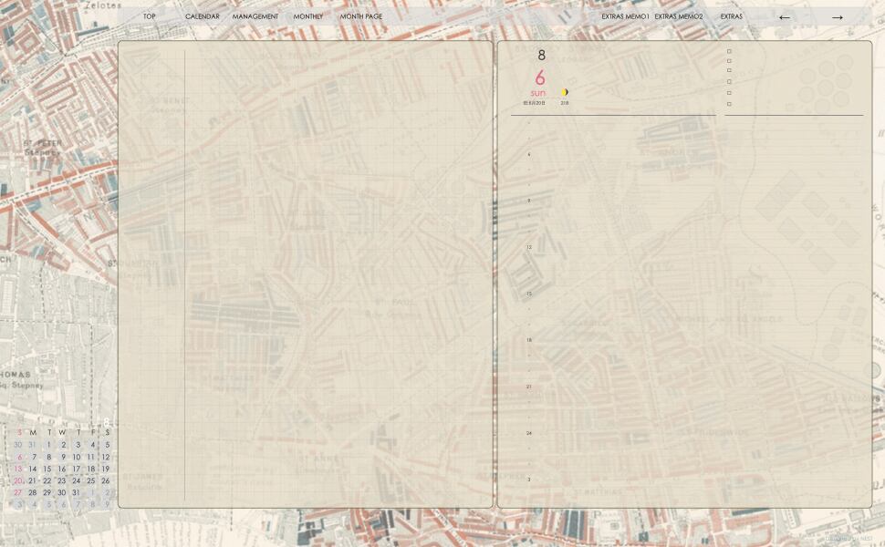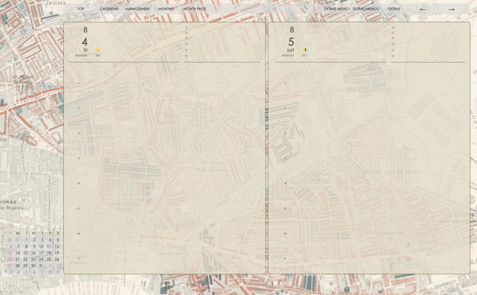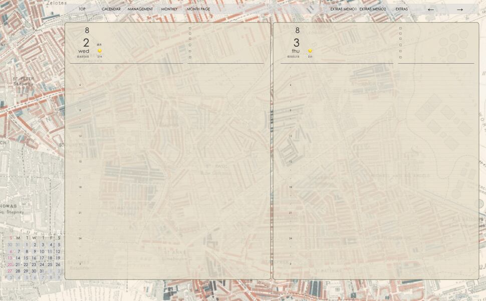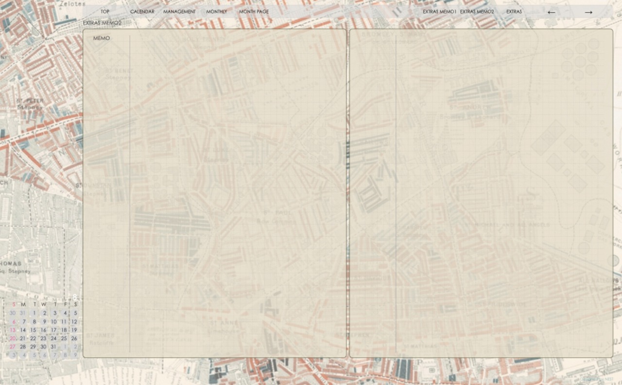 このデザインは表紙だけでなく 中身の手帖のページにも地図を透かしで入れています。