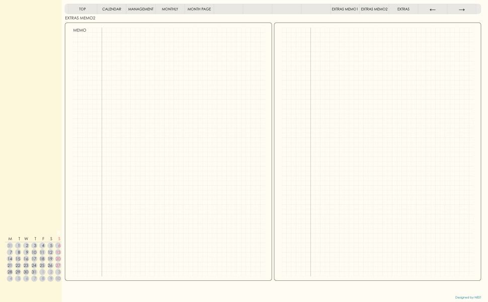 その年、月と手帖のシリーズと月曜、日曜スタートの区別を表記しています。