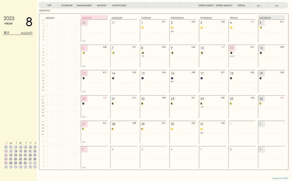 その年、月と手帖のシリーズと月曜、日曜スタートの区別を表記しています。