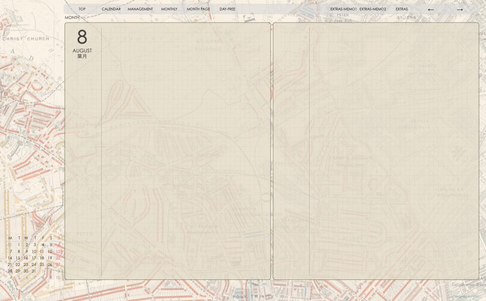 このデザインは表紙だけでなく 中身の手帖のページにも地図を透かしで入れています。