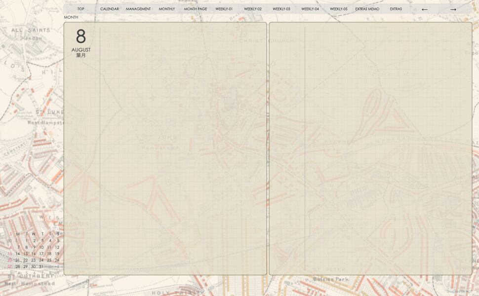 このデザインは表紙だけでなく 中身の手帖のページにも地図を透かしで入れています。