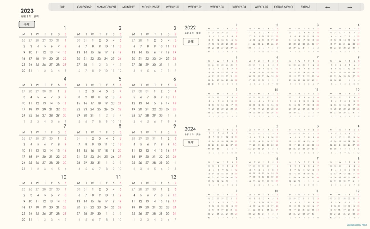 その年、月と手帖のシリーズと月曜、日曜スタートの区別を表記しています。