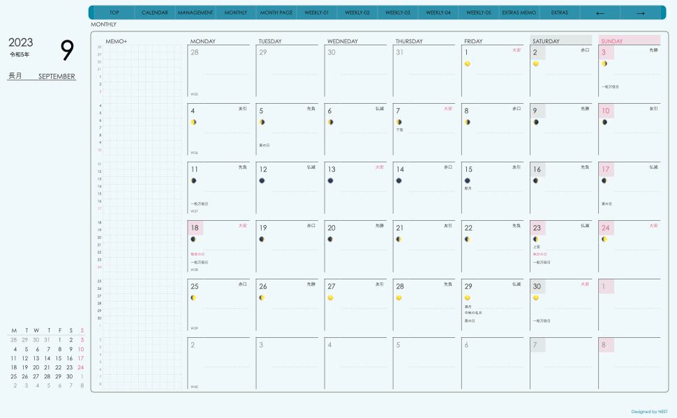 これまでのデザインに 週番号、月の満ち欠け、六曜の表記を