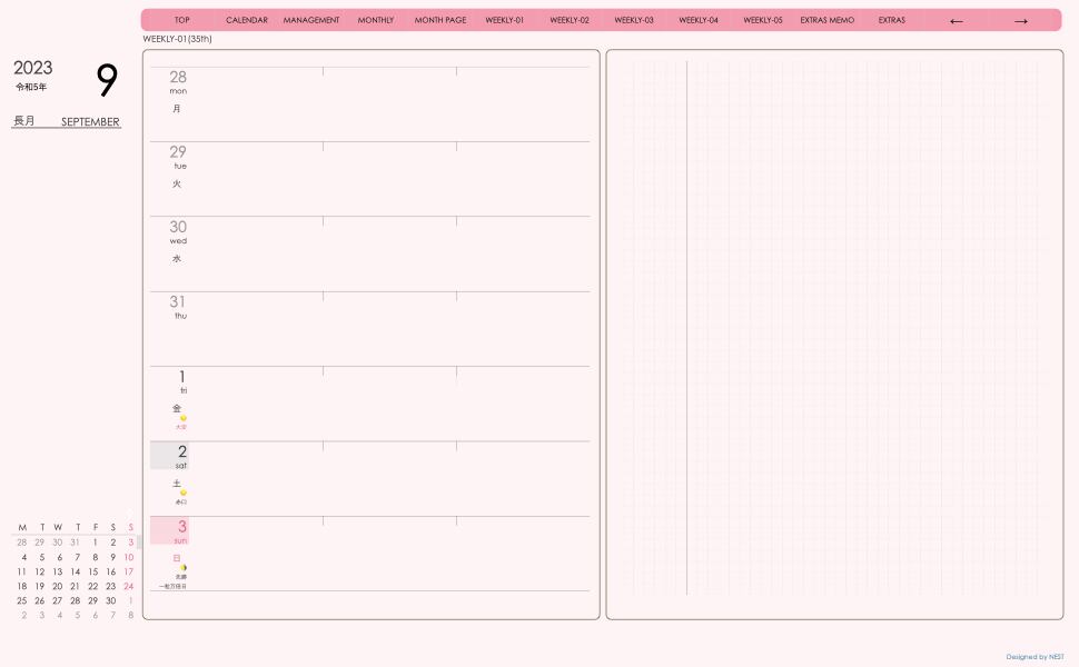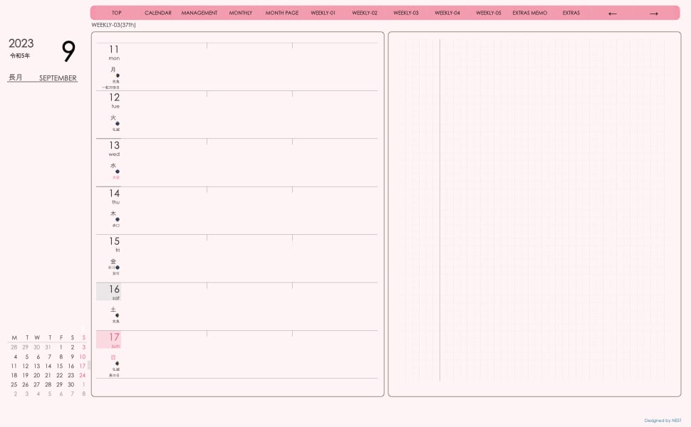 週間予定+メモで 左側に週間予定、右側に方眼メモという