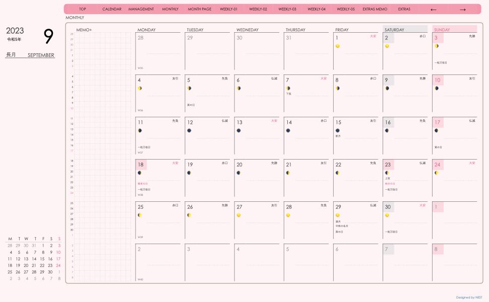 これまでのデザインに 週番号、月の満ち欠け、六曜の表記を