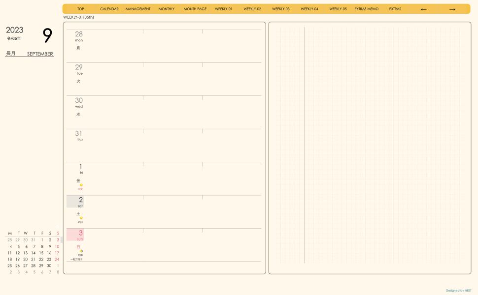 週間予定+メモで 左側に週間予定、右側に方眼メモという