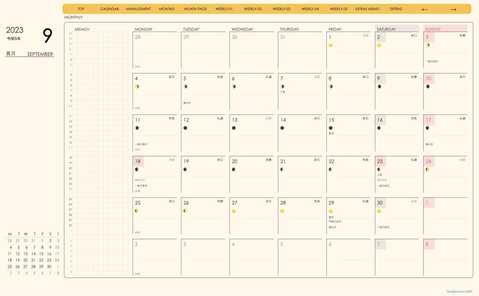 これまでのデザインに 週番号、月の満ち欠け、六曜の表記を
