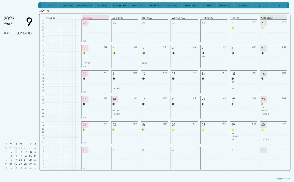 これまでのデザインに 週番号、月の満ち欠け、六曜の表記を