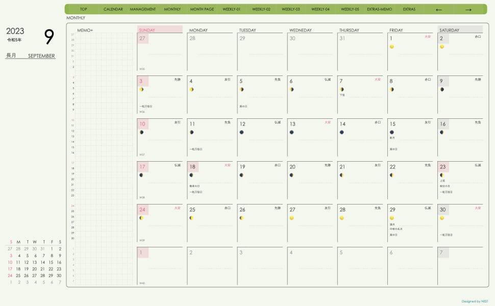 これまでのデザインに 週番号、月の満ち欠け、六曜の表記を
