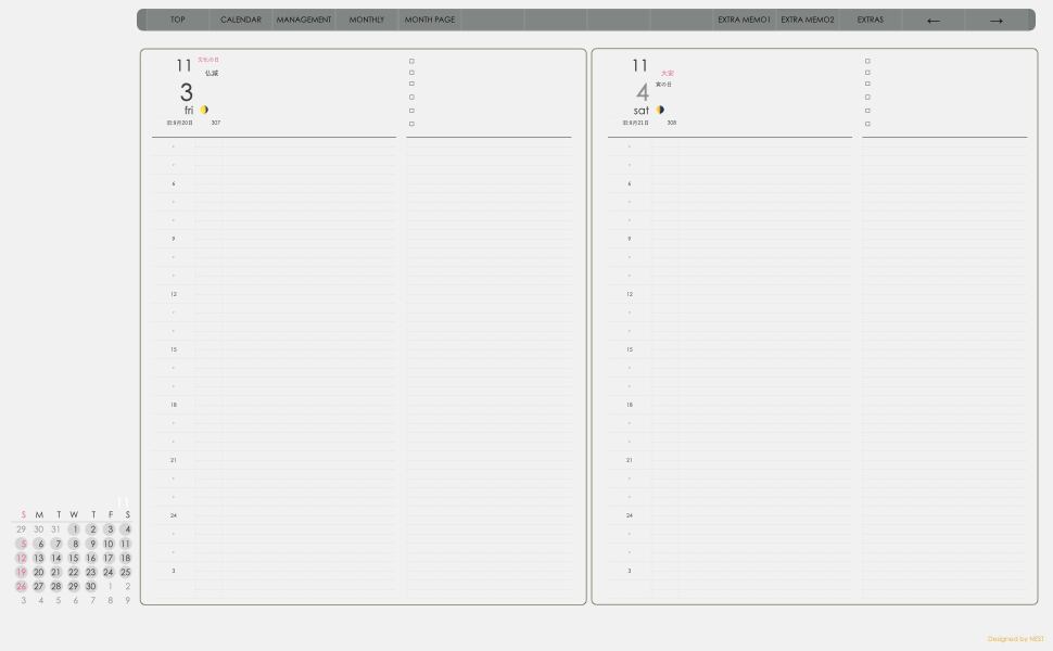 ミニカレンダーの日付の部分を押すとその日付のページへリンクとなり