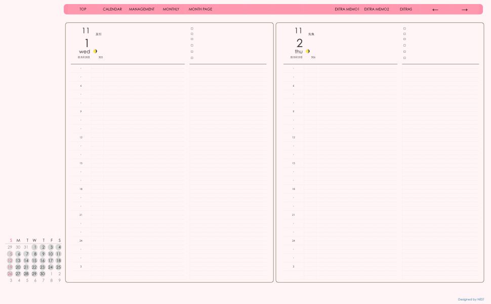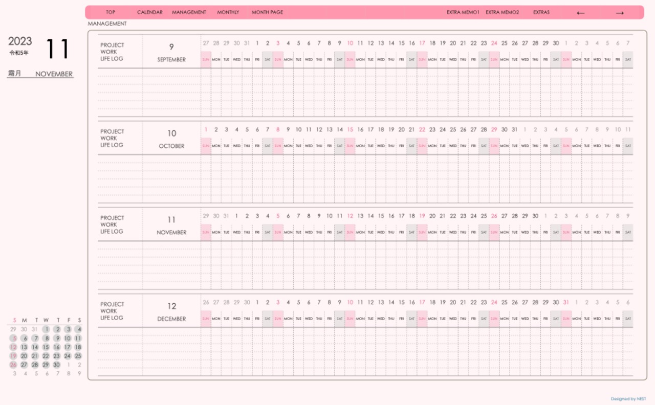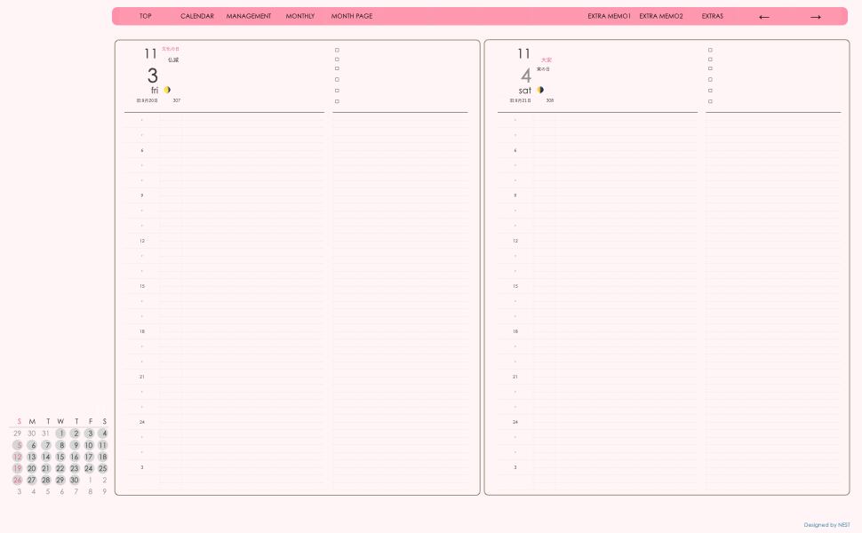 **手帖(dayシリーズ)日曜日始まり2023.11月版**ピンク