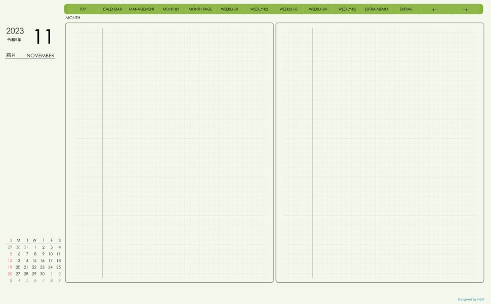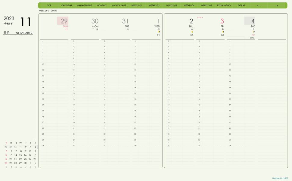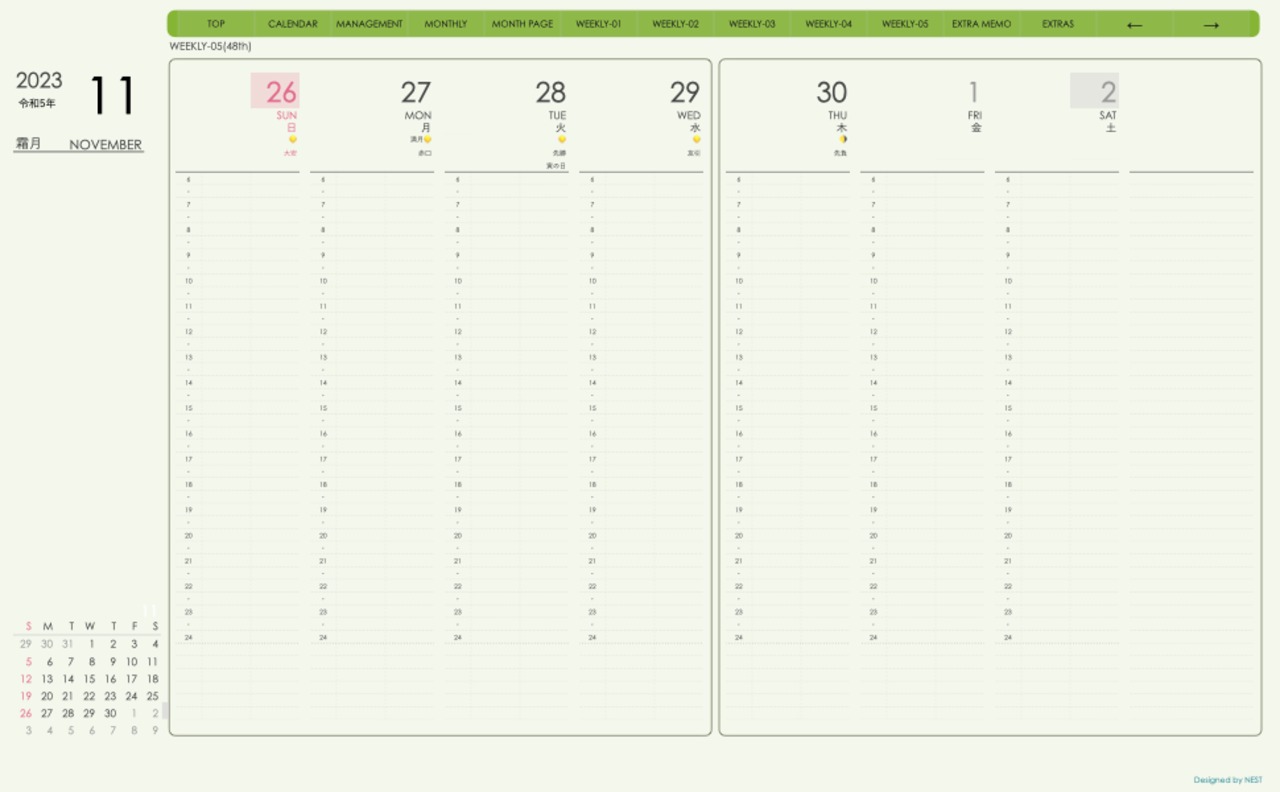 **手帖(week-verticalシリーズ)日曜日始まり2023.11月版**グリーン