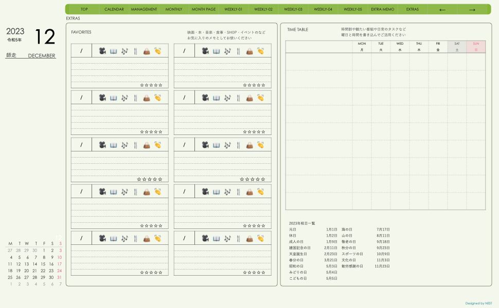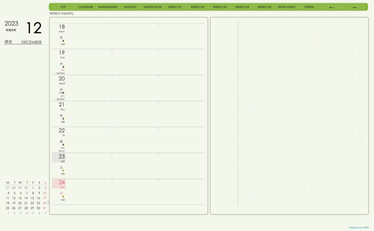 **手帖(week-leftシリーズ)月曜日始まり2023.12月版**
