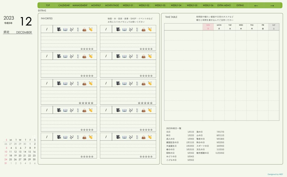 **手帖(week-leftシリーズ)日曜日始まり2023.12月版**