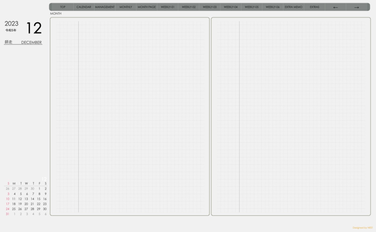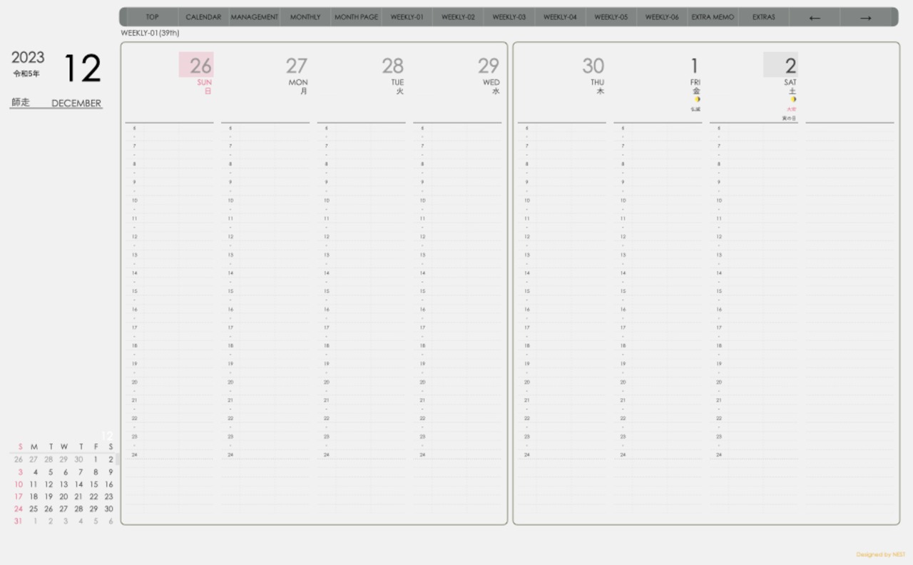 **手帖(week-verticalシリーズ)日曜日始まり2023.12月版**