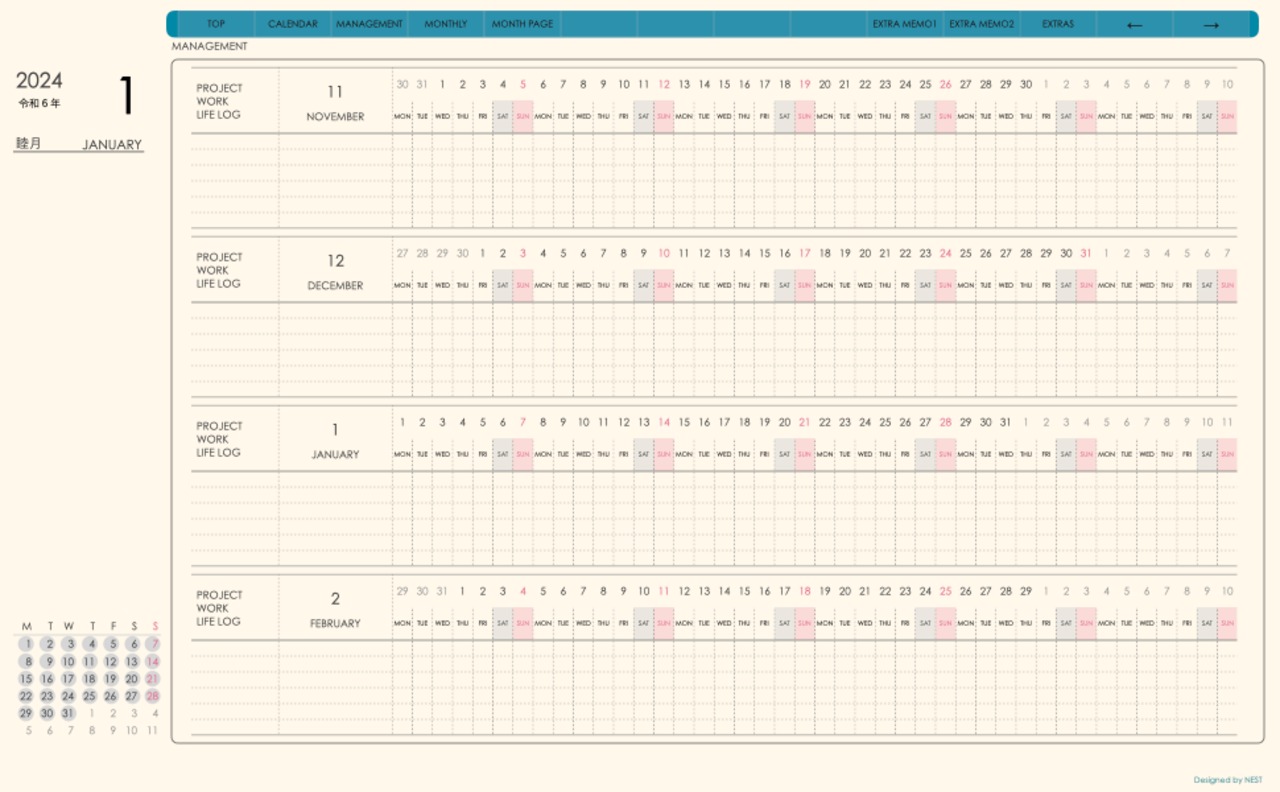 **手帖(dayシリーズ)日曜日始まり2024.01月版**