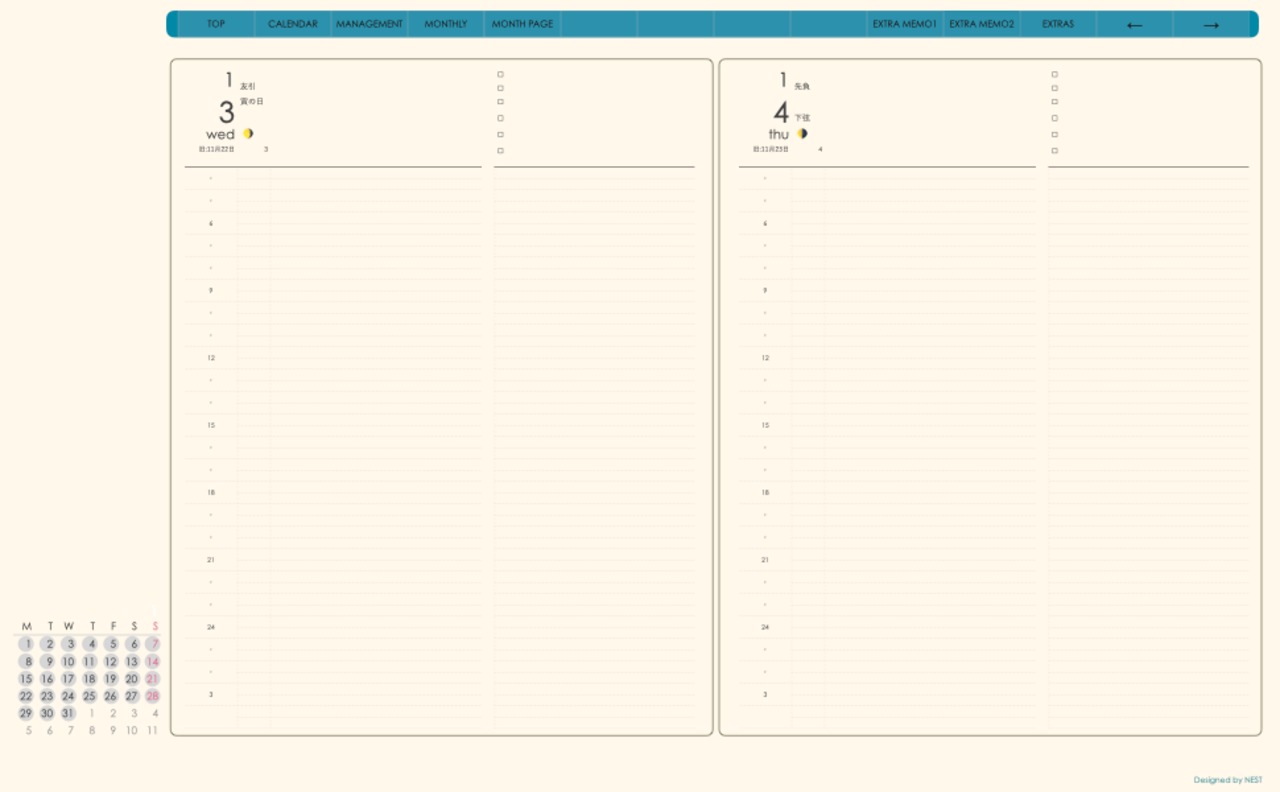 ミニカレンダーの日付の部分を押すとその日付のページへリンクとなり