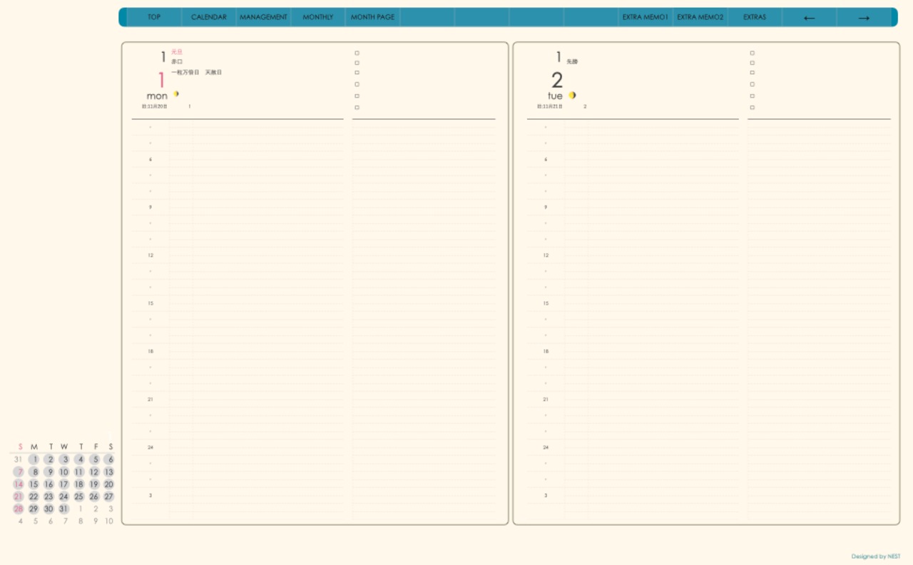 ミニカレンダーの日付の部分を押すとその日付のページへリンクとなり