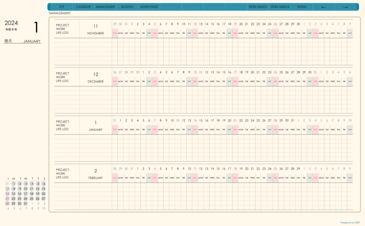 毎月の予定やスケジュールを手書きで記入するというアナログ感覚も、このデジタルプランナーならではの楽しみ方です。使いやすいインターフェースで編集も簡単に行え、1ヶ月単位の予定を整理・管理するのに便利です。