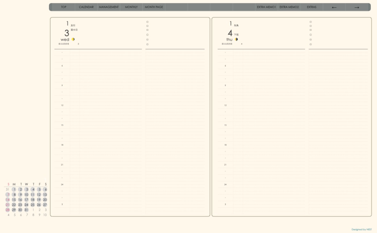 ミニカレンダーの日付の部分を押すとその日付のページへリンクとなり