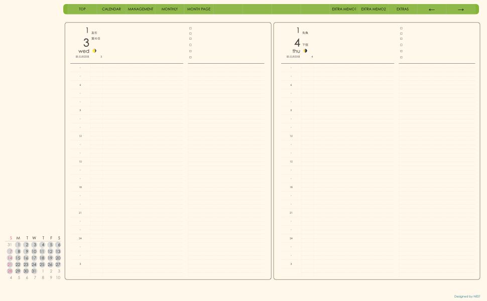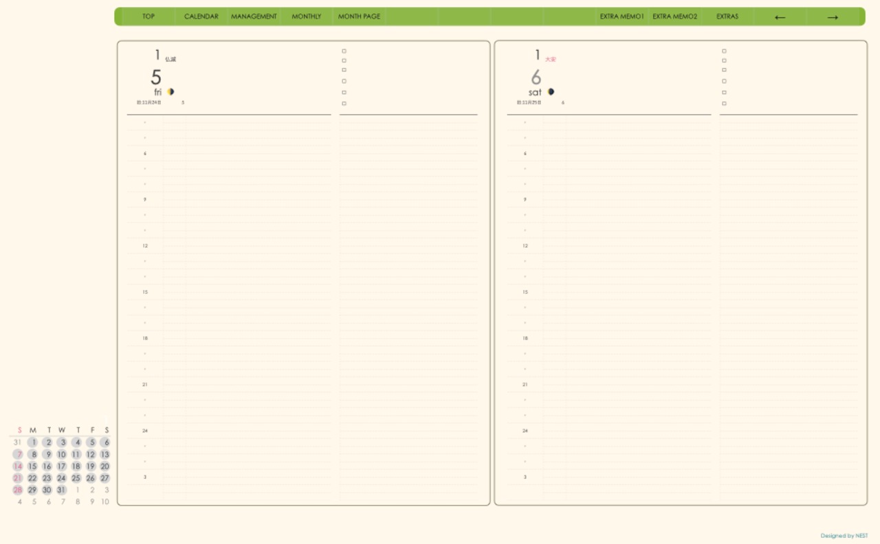 ミニカレンダーの日付の部分を押すとその日付のページへリンクとなり