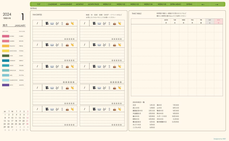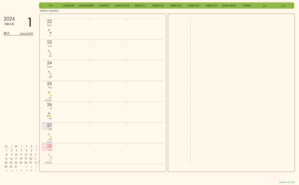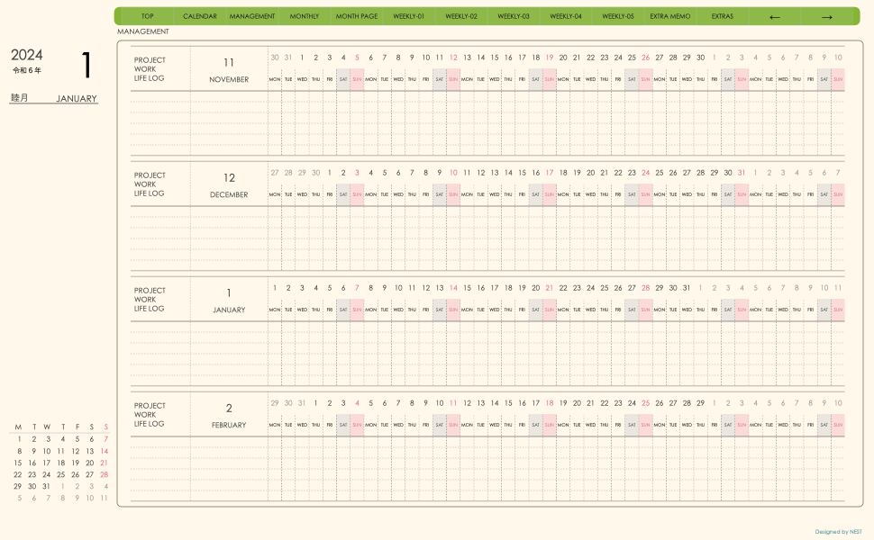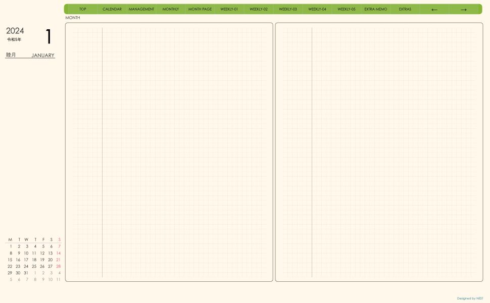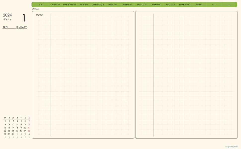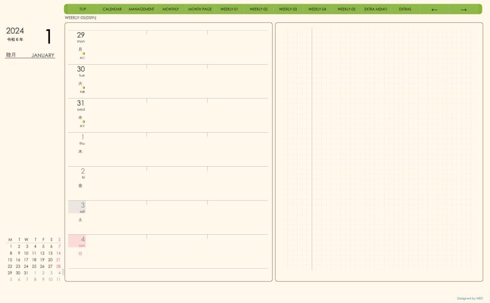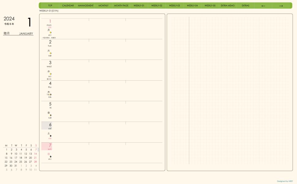 **手帖(week-leftシリーズ)日曜日始まり2024.01月版**