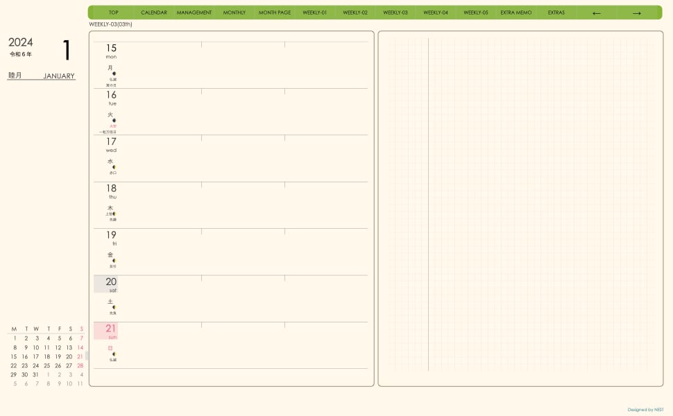 ・週間予定+メモで 左側に週間予定、右側に方眼メモという