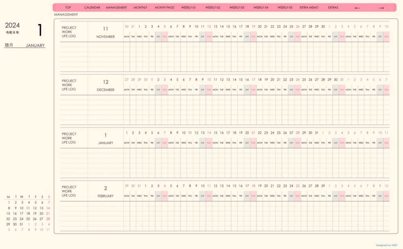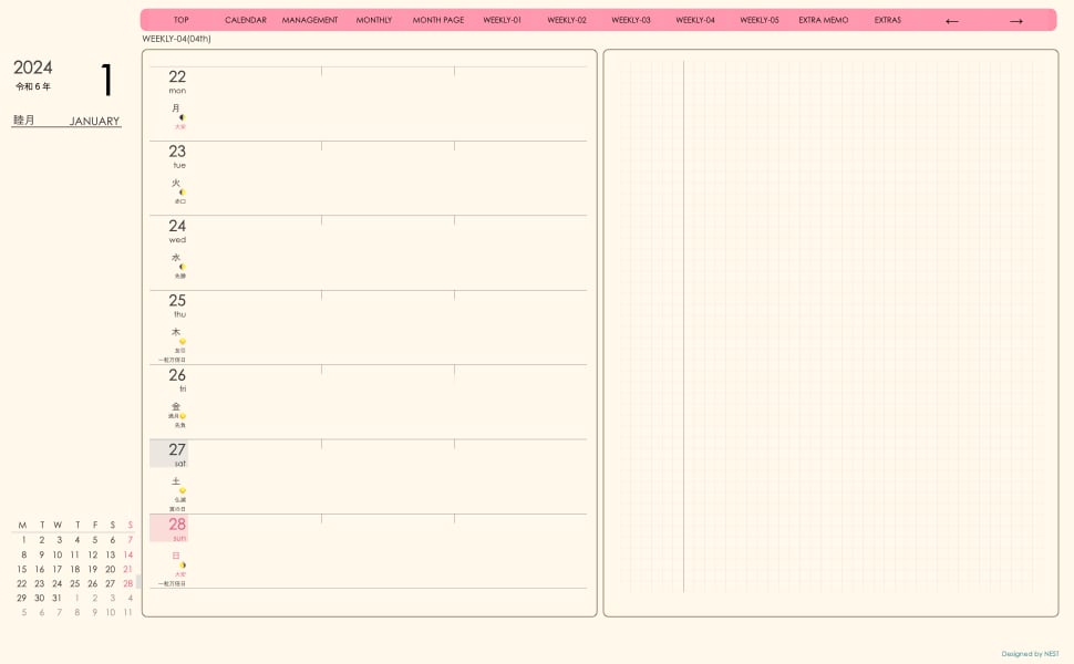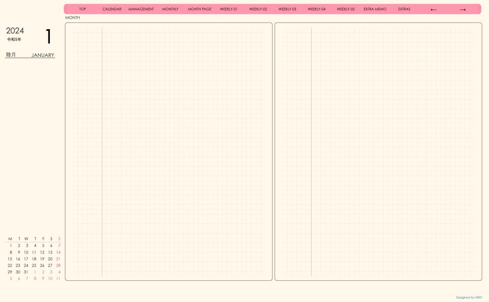 **手帖(week-leftシリーズ)日曜日始まり2024.01月版**