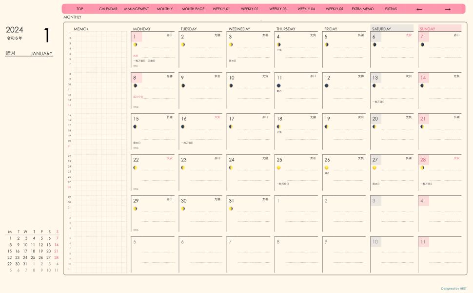 **(week-leftシリーズ)日曜日始まり2024.01月版**の登場!