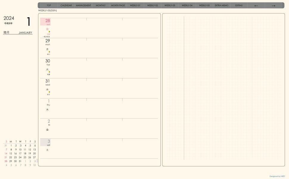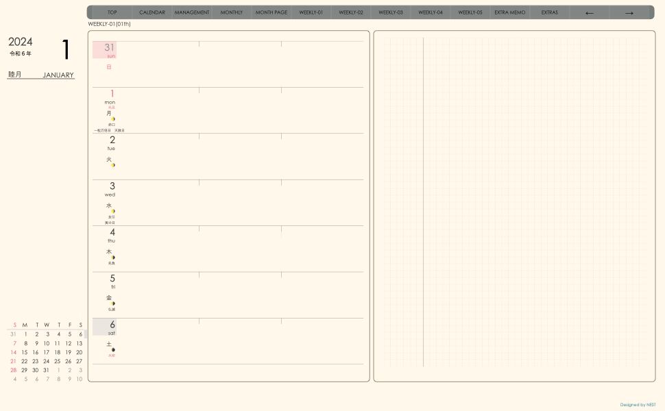 **手帖(week-leftシリーズ)日曜日始まり2024.01月版**
