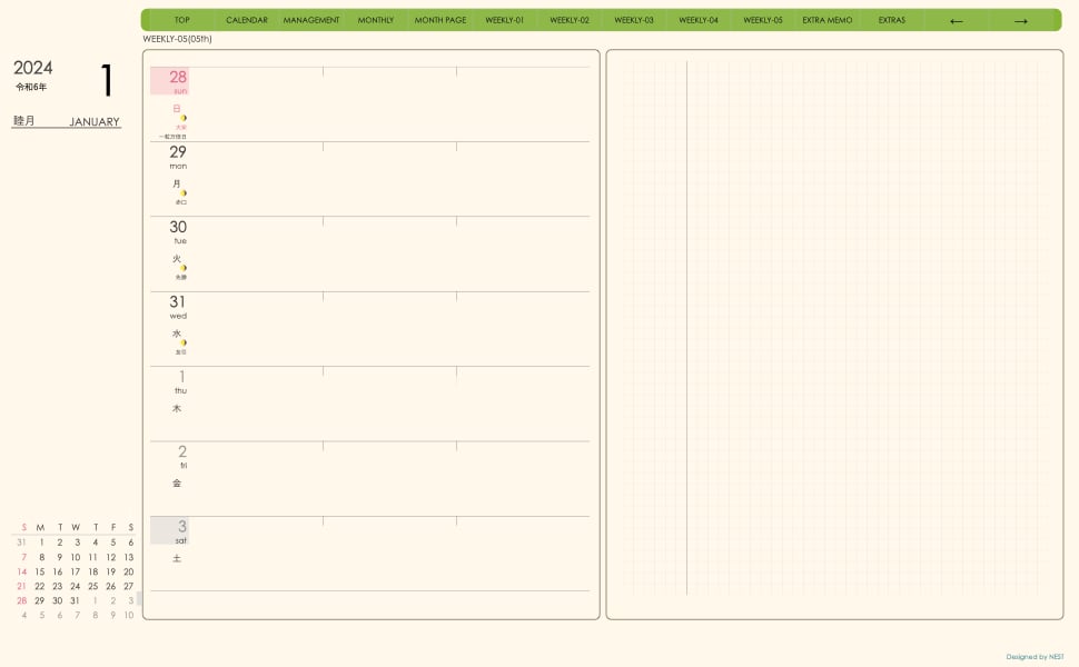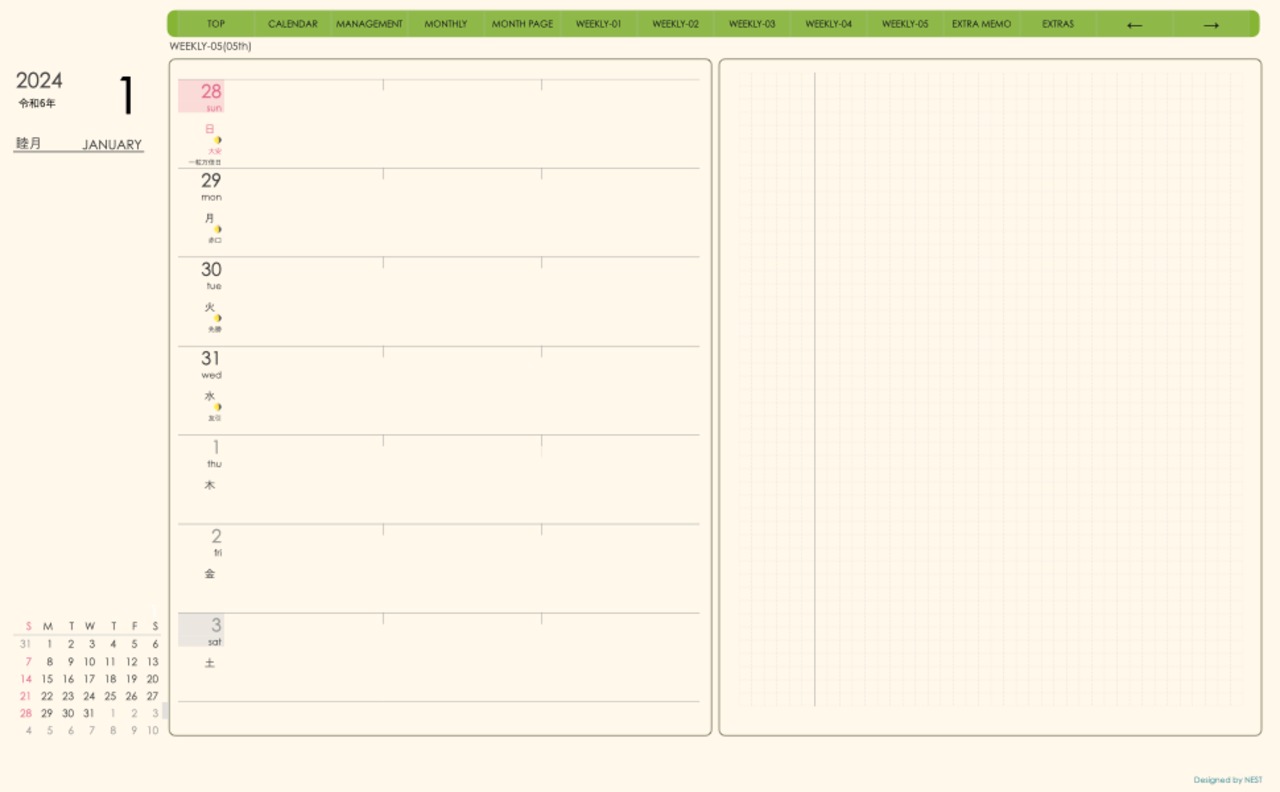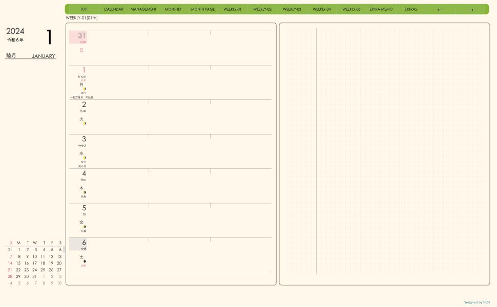 **手帖(week-leftシリーズ)日曜日始まり2024.01月版**