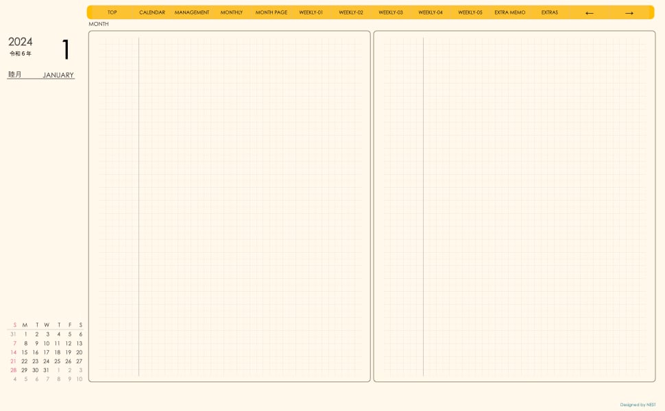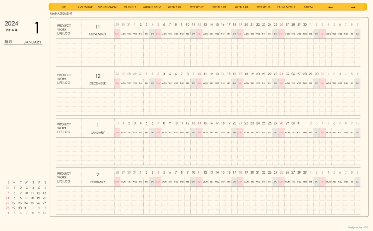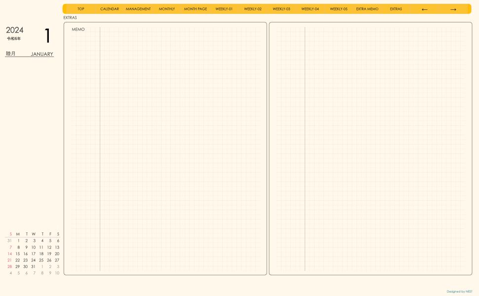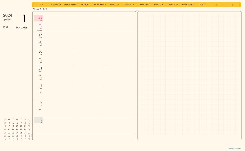 **手帖(week-leftシリーズ)日曜日始まり2024.01月版**