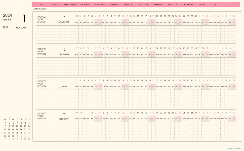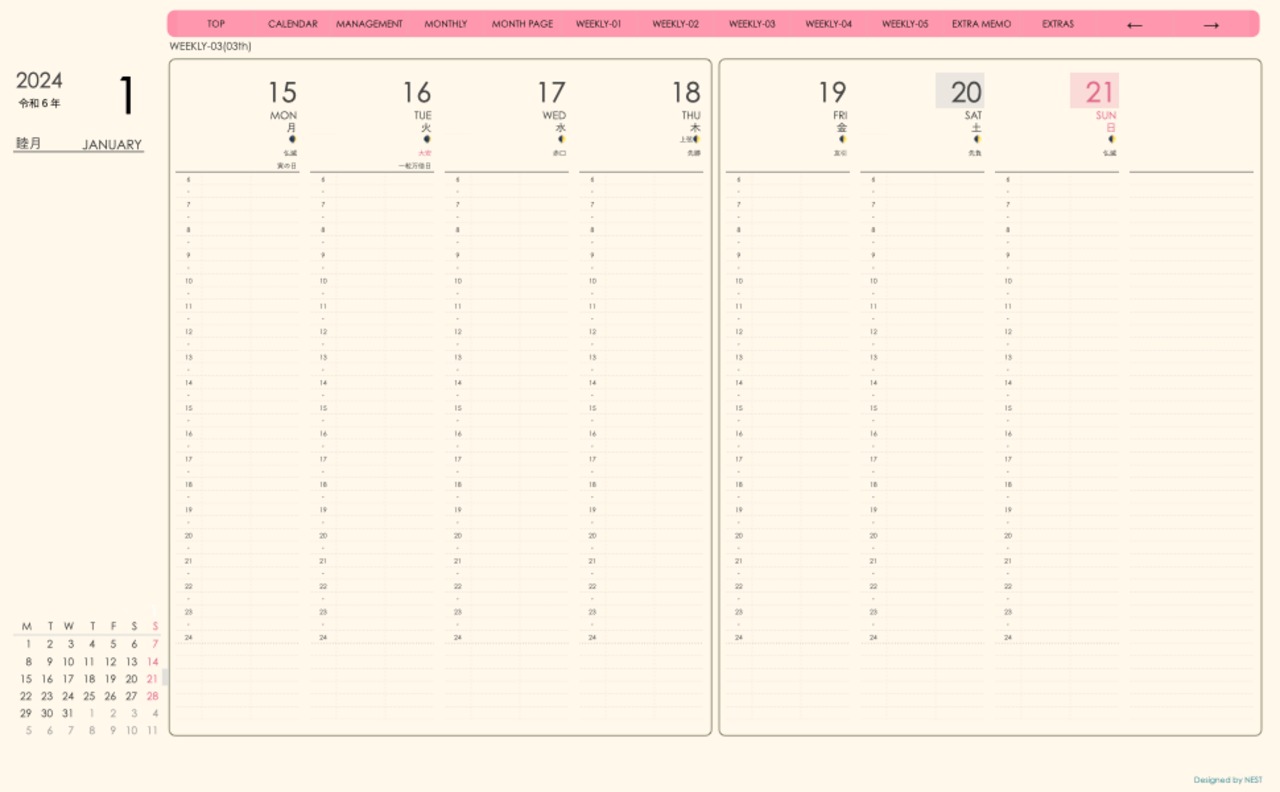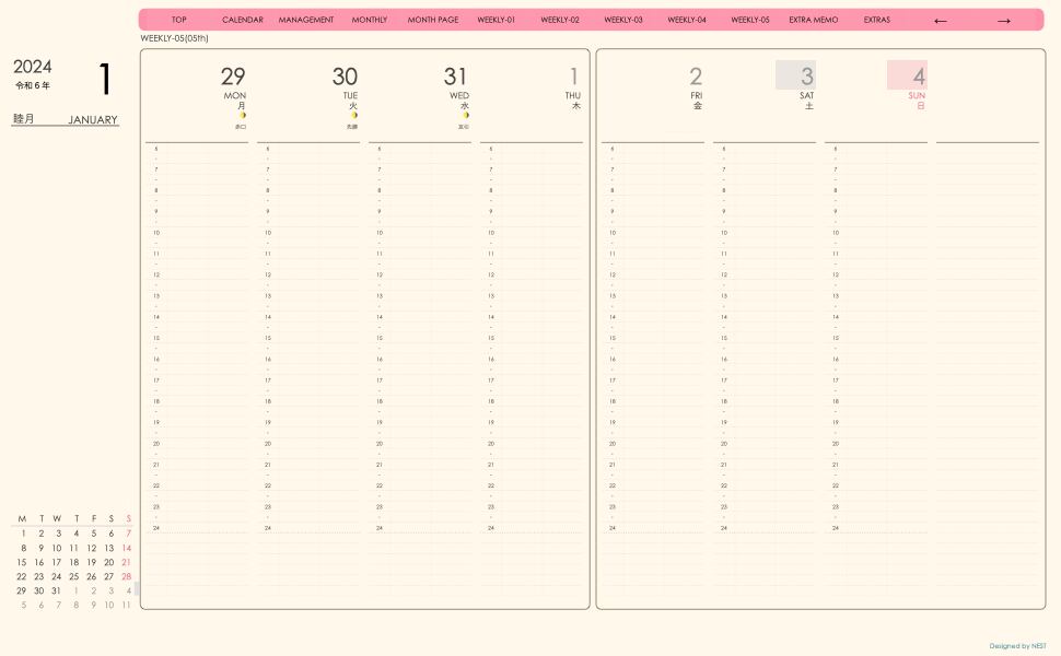 **手帖(week-verticalシリーズ)日曜日始まり2024.01月版**
