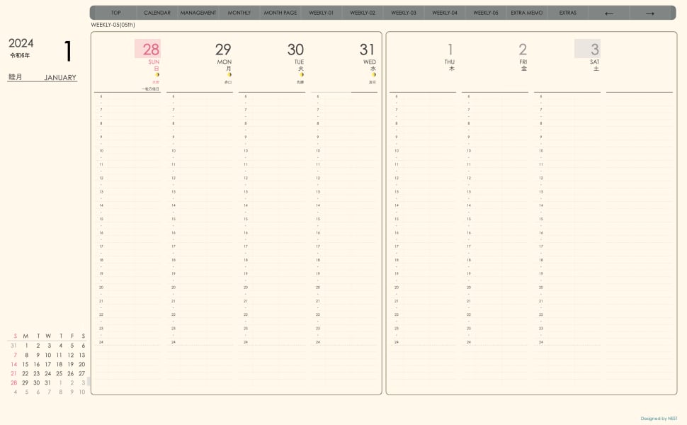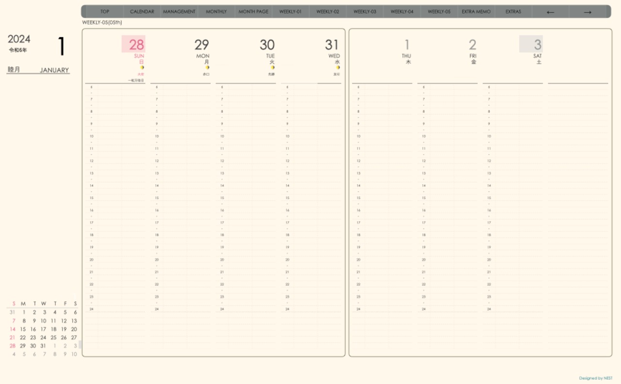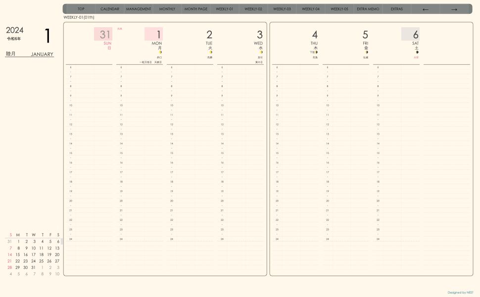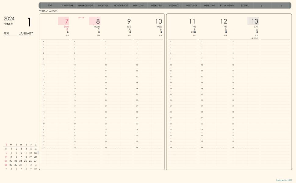 **手帖(week-verticalシリーズ)日曜日始まり2024.01月版**
