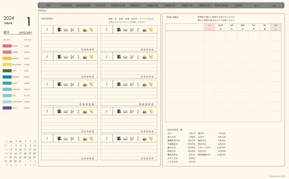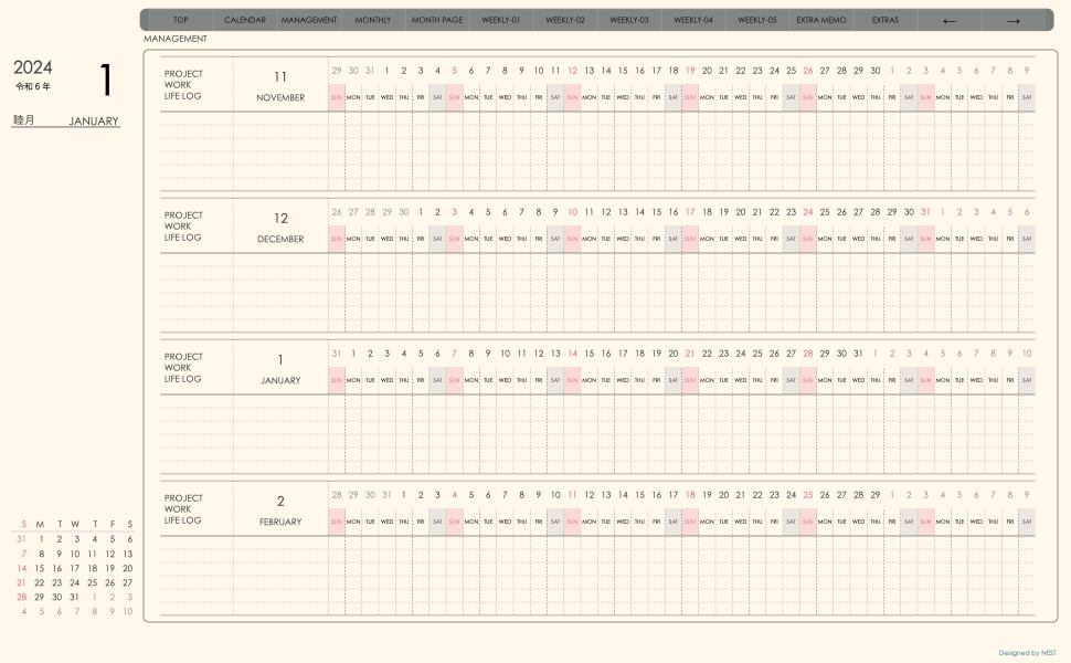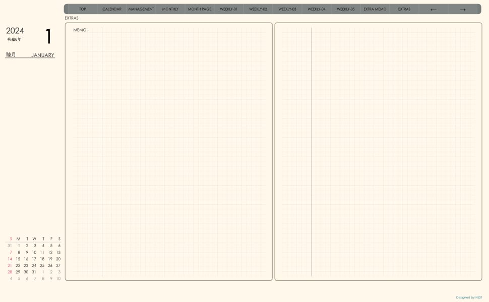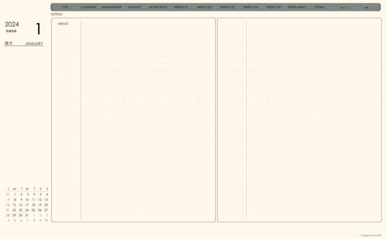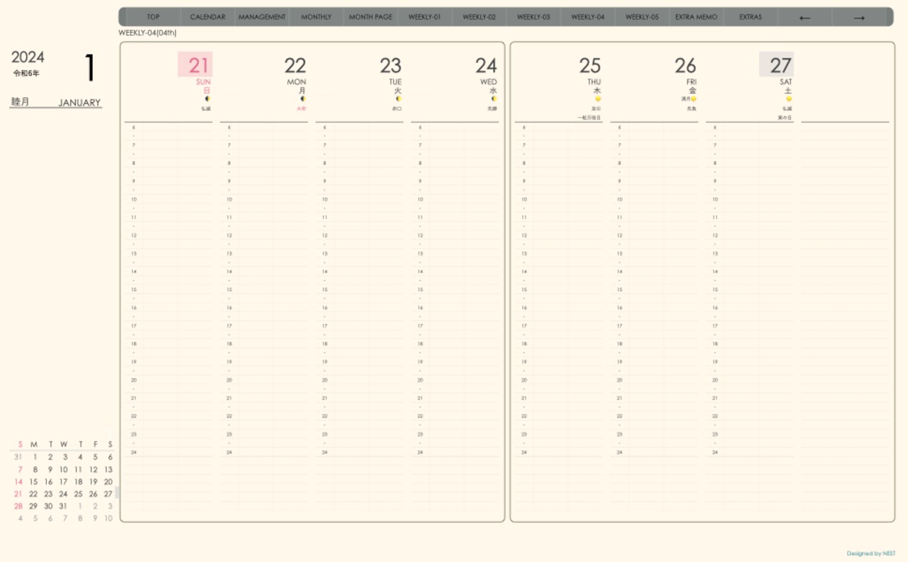 **手帖(week-verticalシリーズ)日曜日始まり2024.01月版**