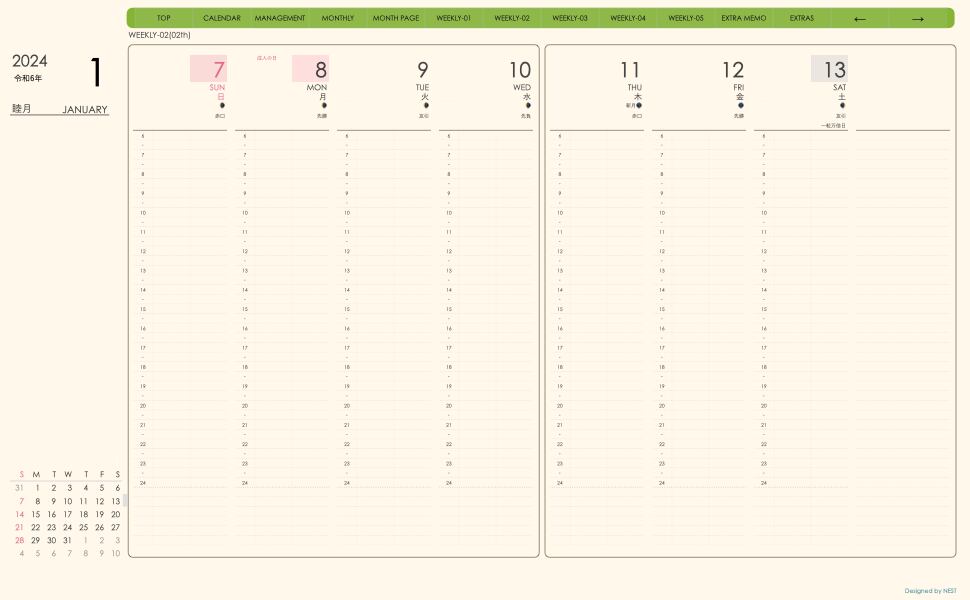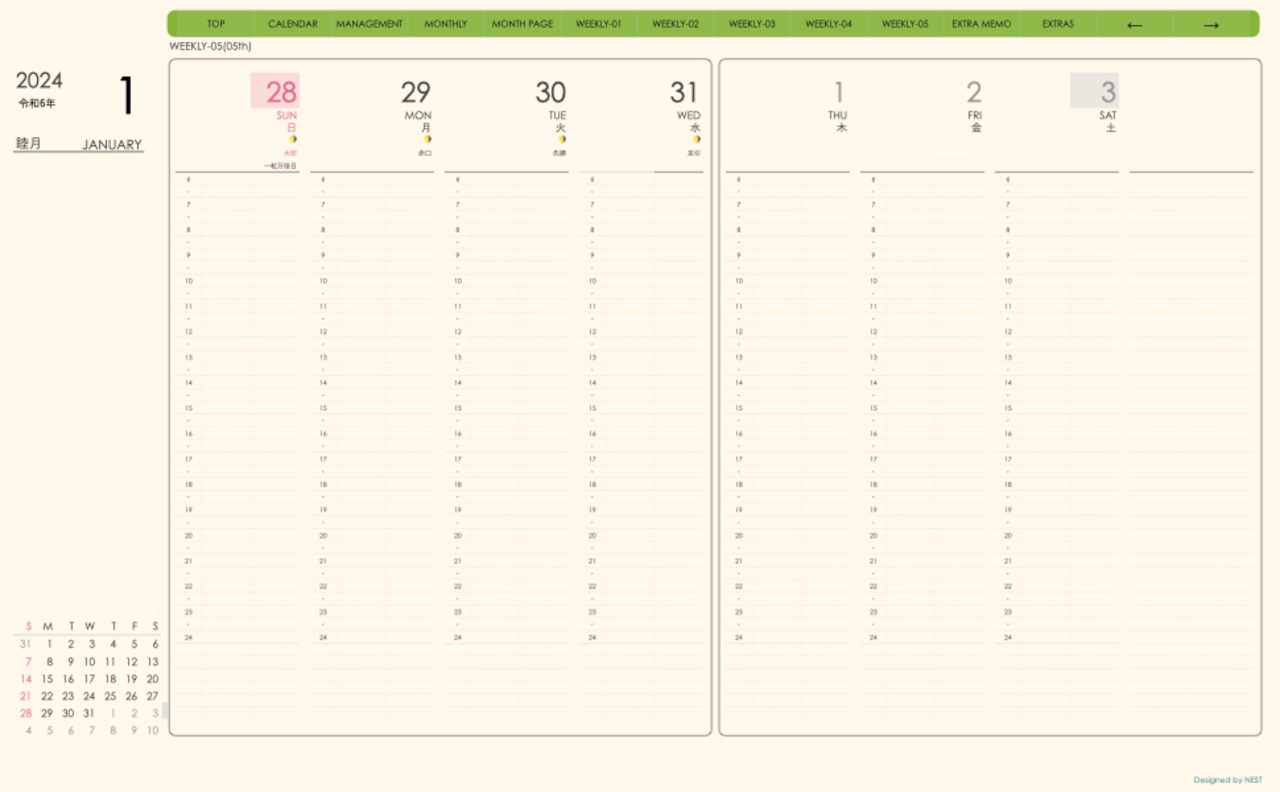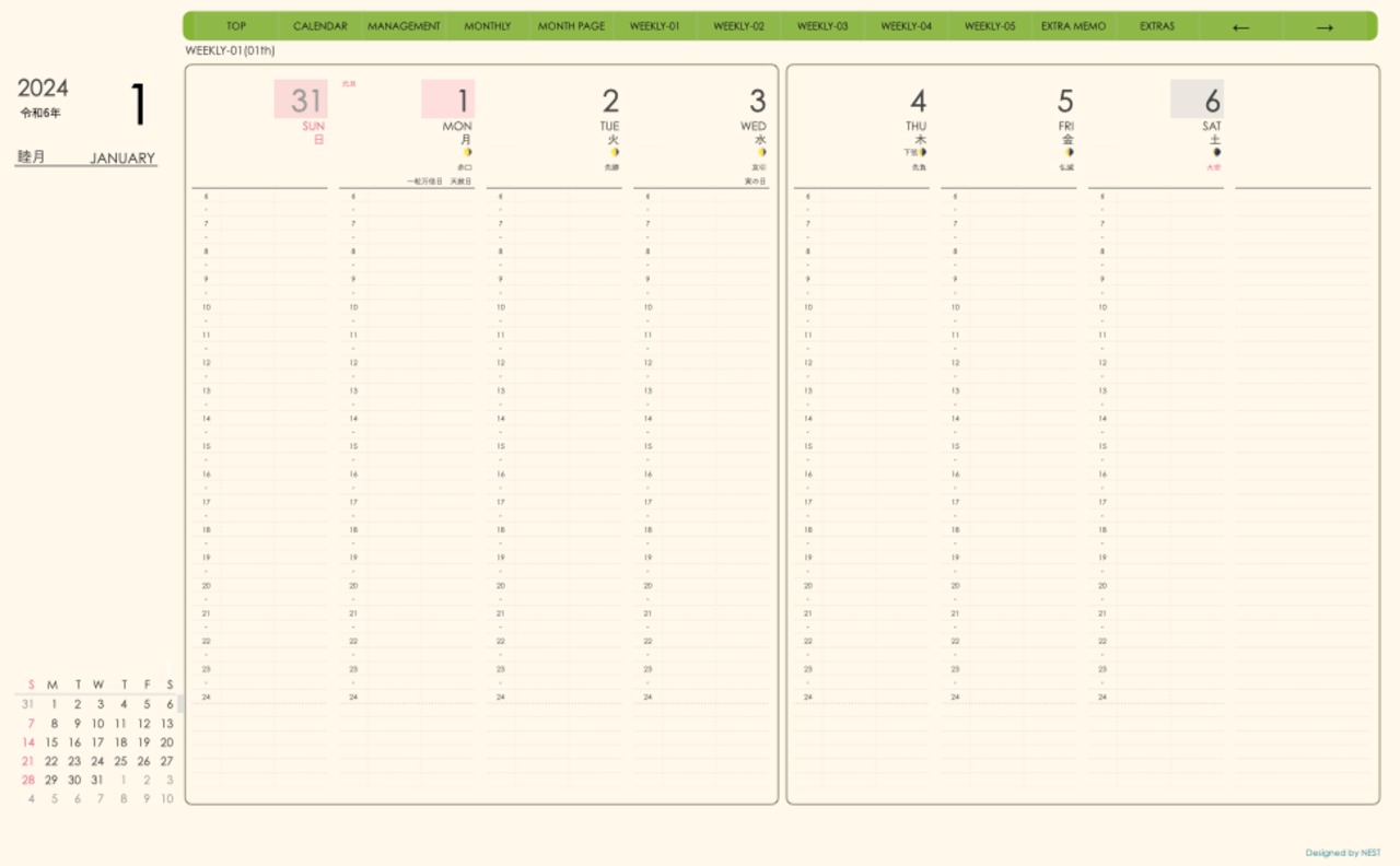 **手帖(week-verticalシリーズ)日曜日始まり2024.01月版**