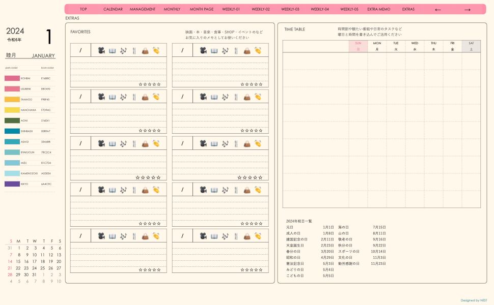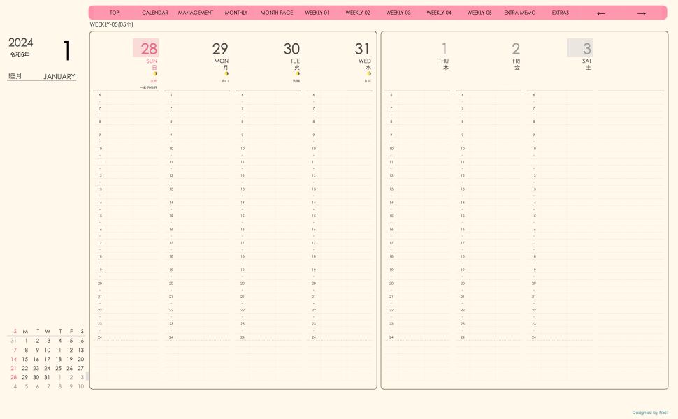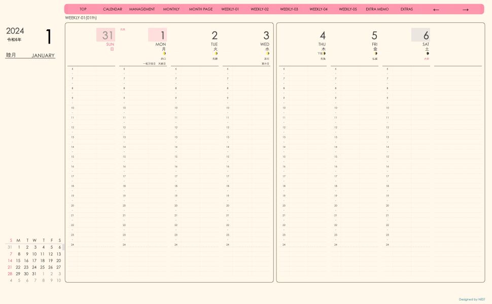 **手帖(week-verticalシリーズ)日曜日始まり2024.01月版**