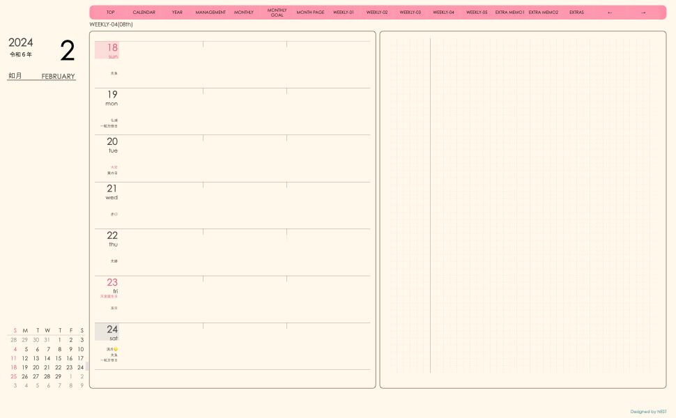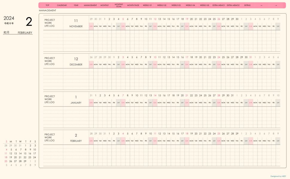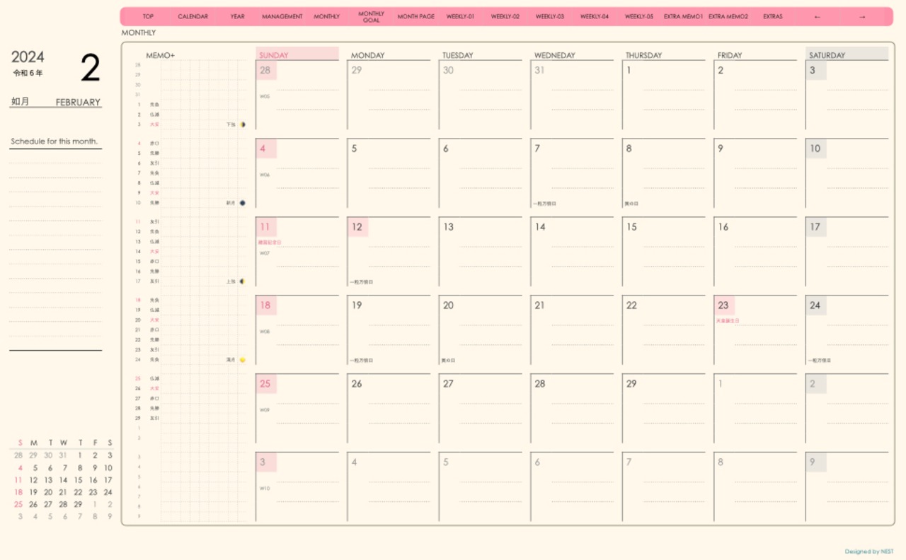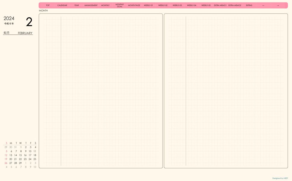 **手帖(week-leftシリーズ)日曜日始まり2024.02月版**