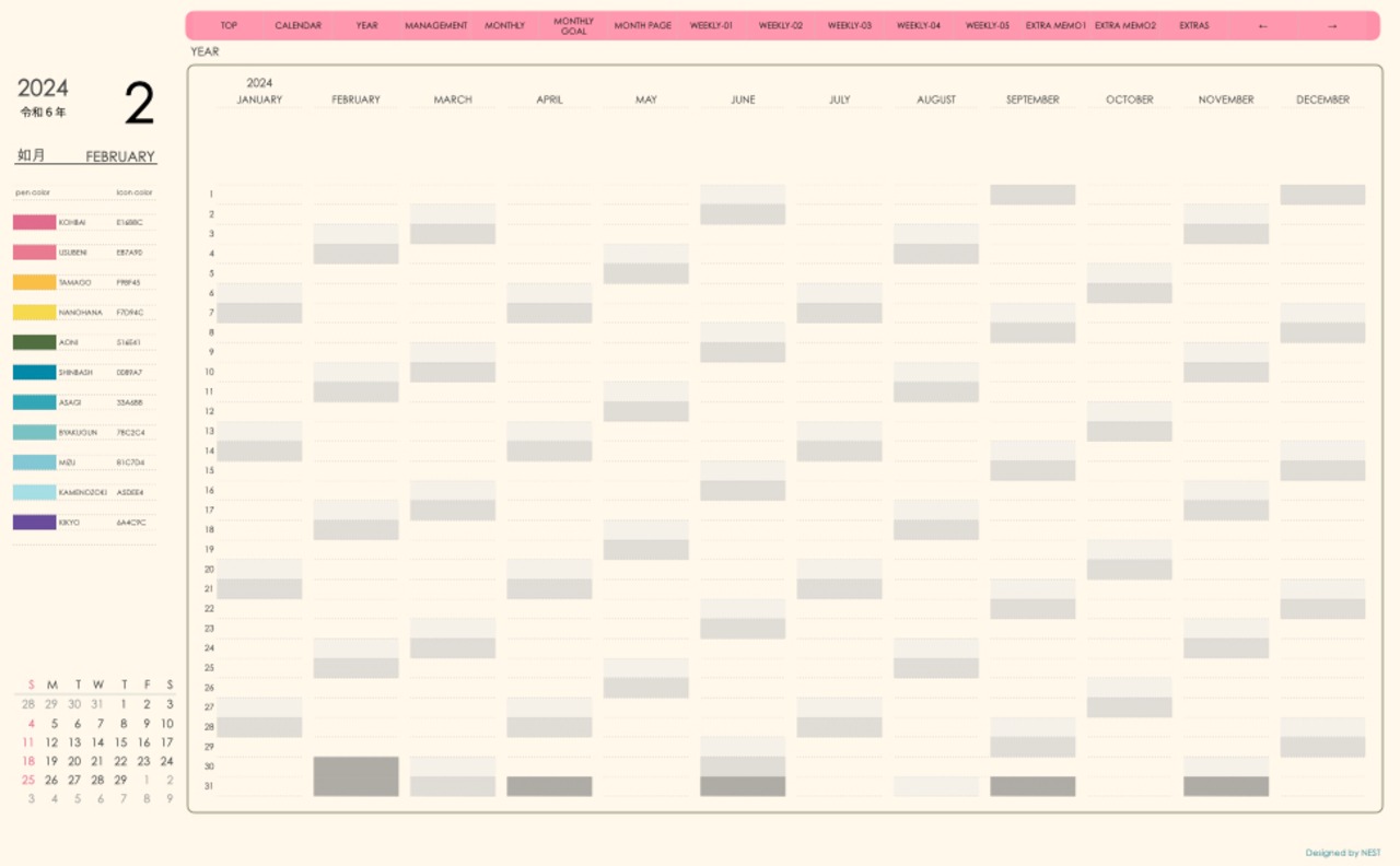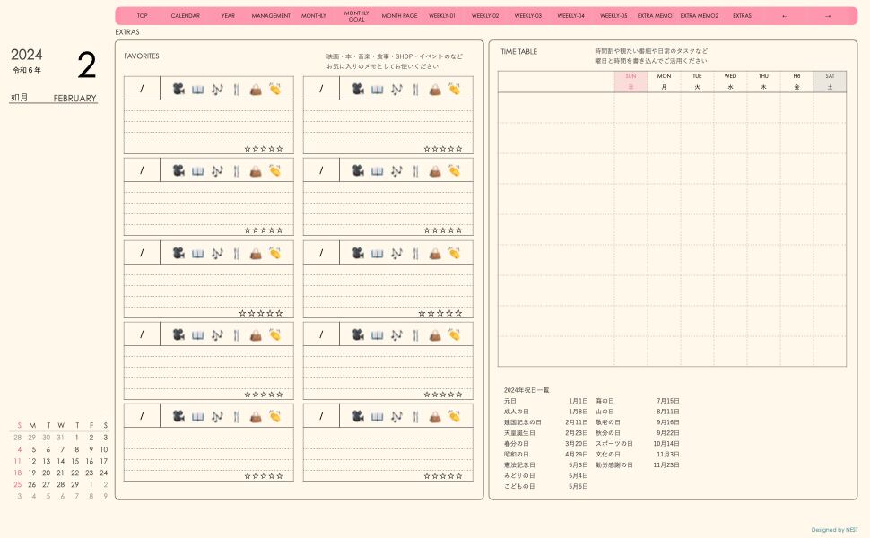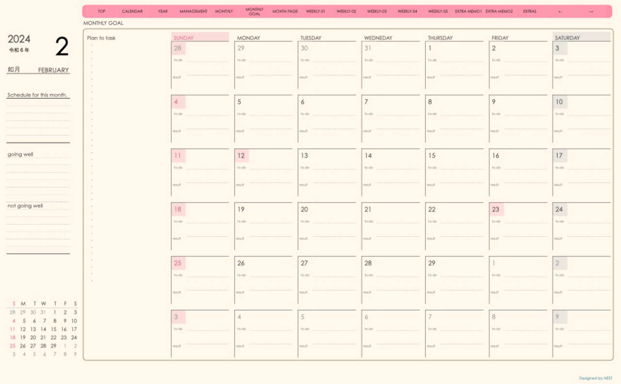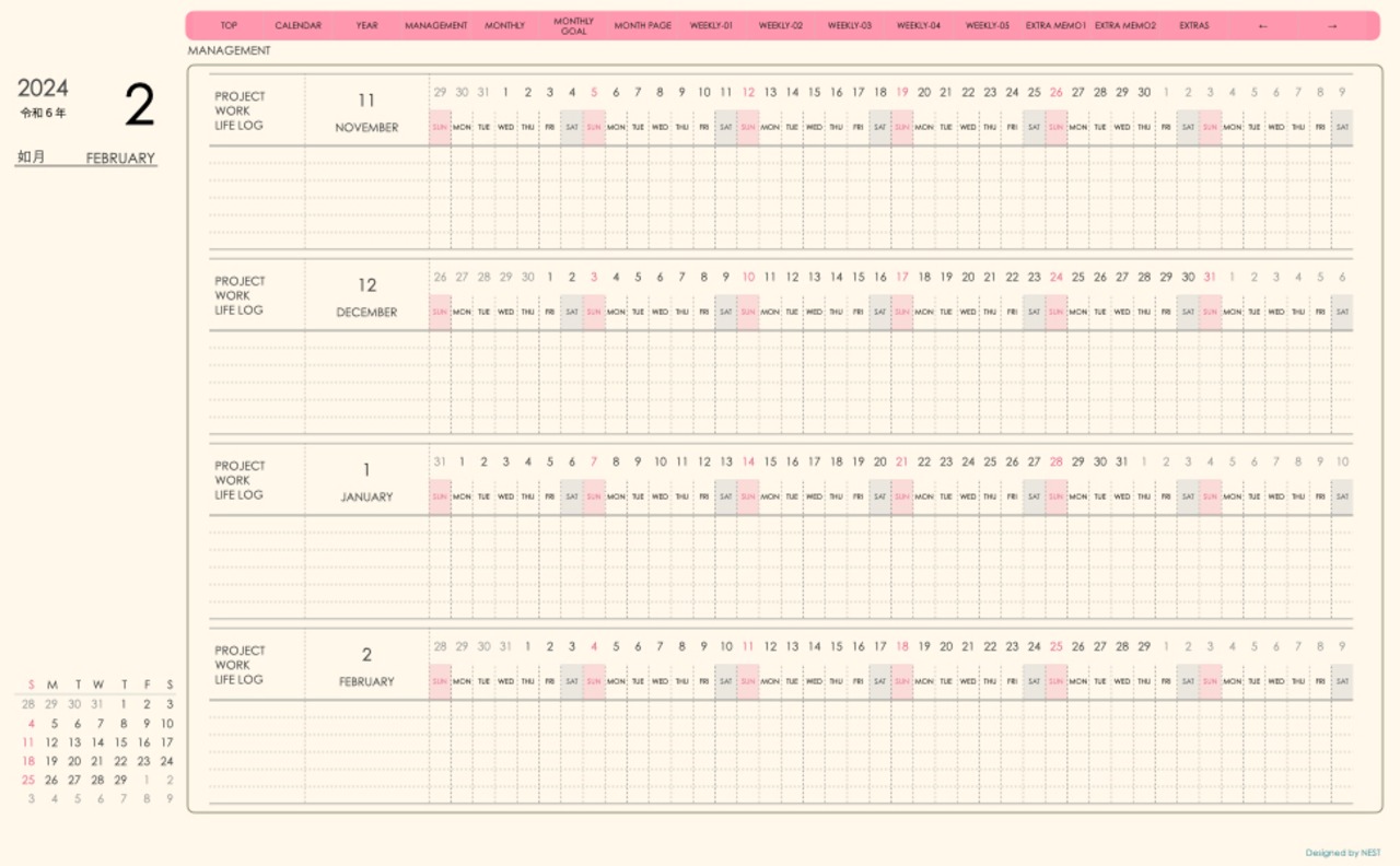 **手帖(week-leftシリーズ)日曜日始まり2024.02月版**
