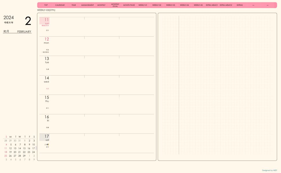・週間予定+メモで 左側に週間予定、右側に方眼メモという
