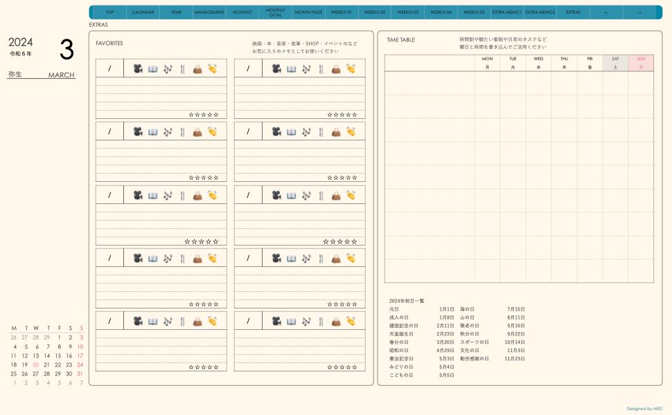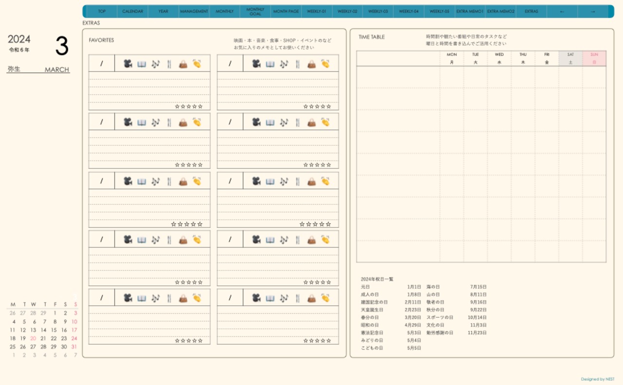 ・日本の祝日を表記(ミニカレンダーにも表記 **3月版から**)