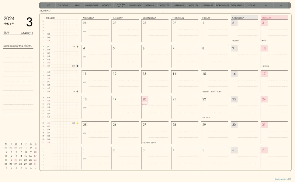 ・日本の祝日を表記(ミニカレンダーにも表記 **3月版から**)