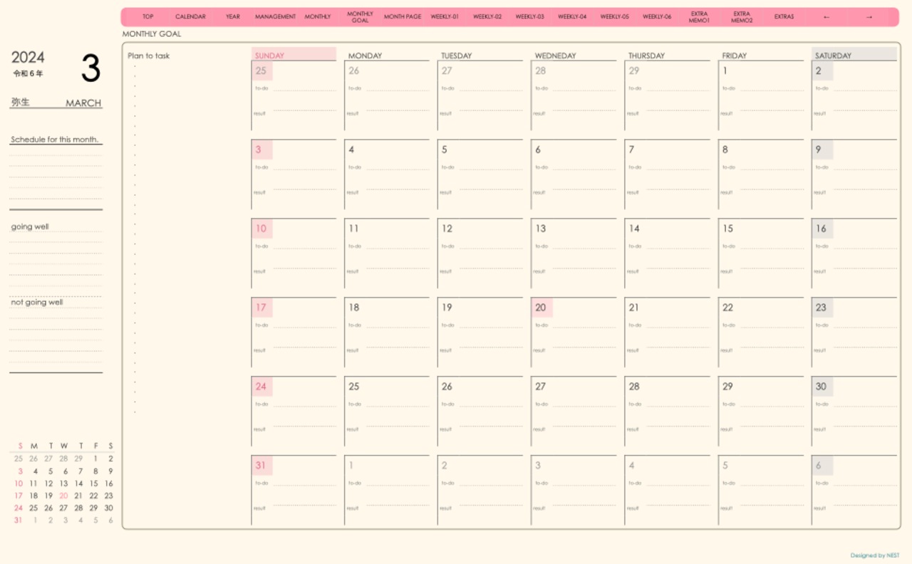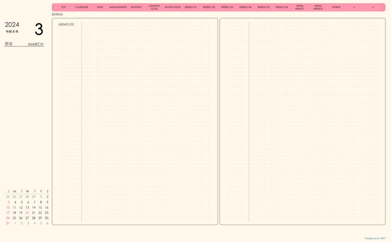 予定の把握と その日のメモの両方が使えるレイアウトとなっていて