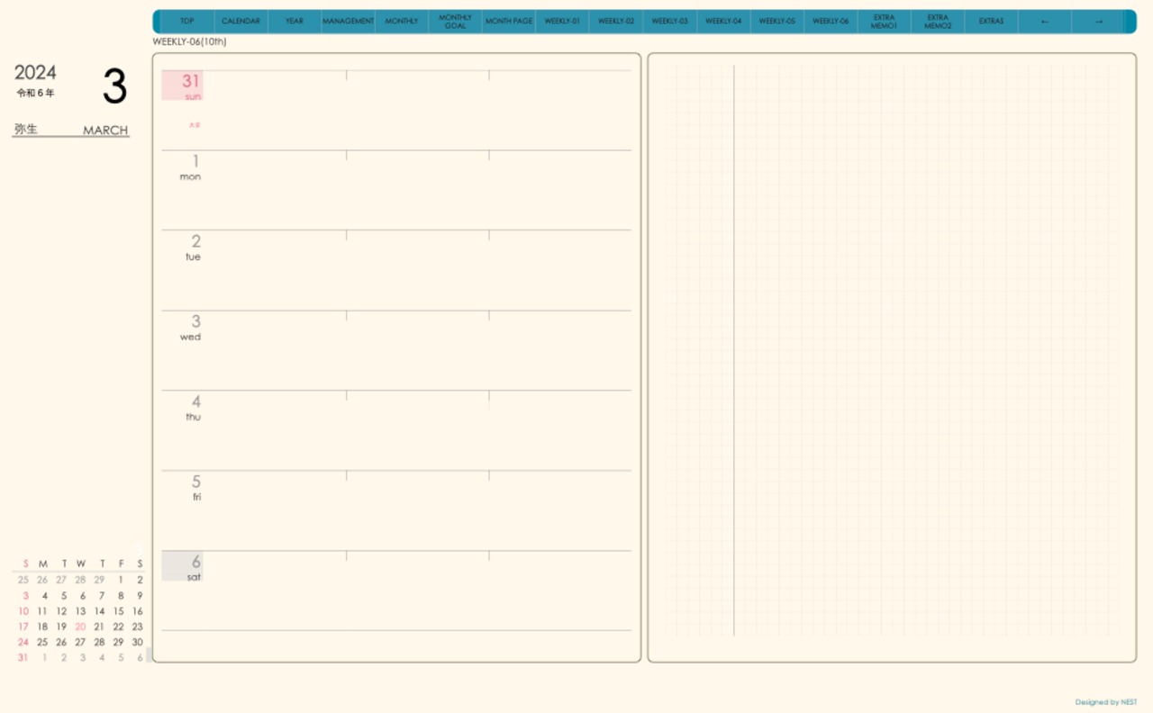 ・ウィークリー(leftデザイン)5ページ(月曜始まり)6ページ(日曜始まり)