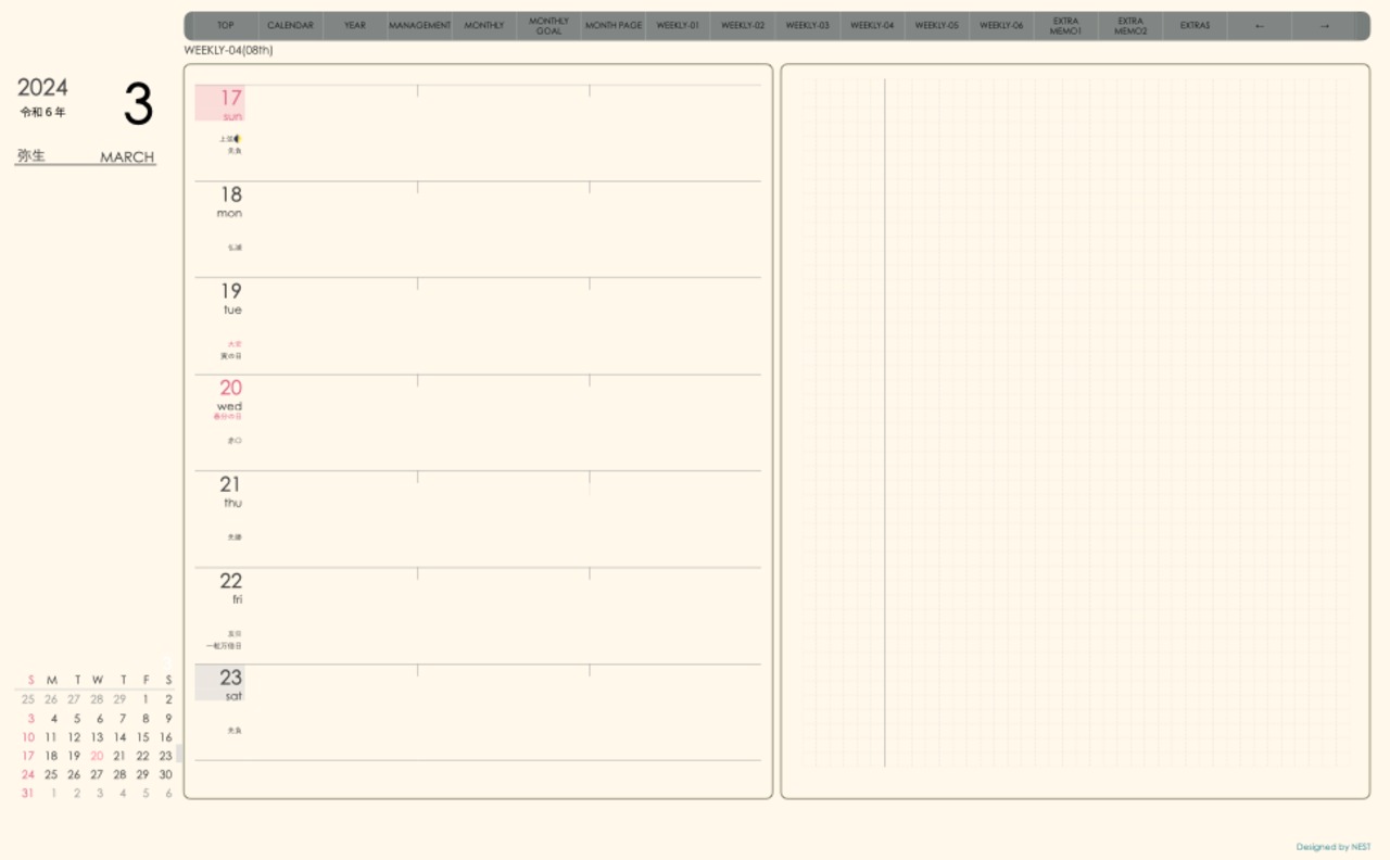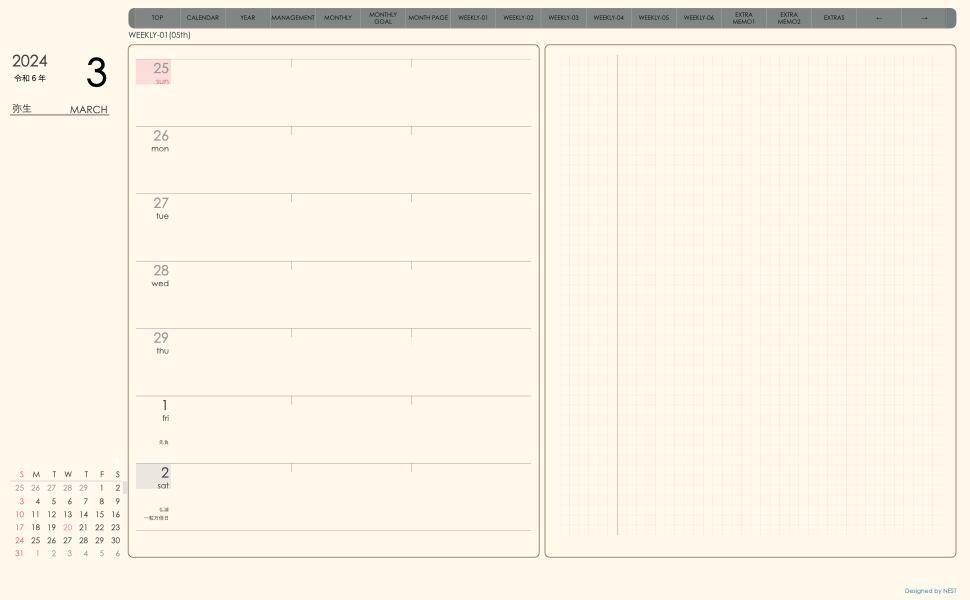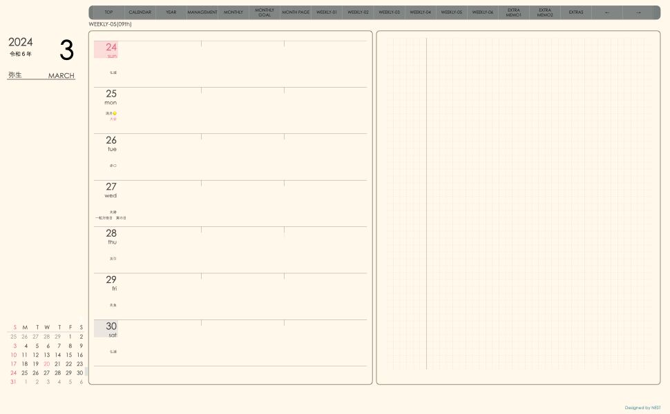 ・週間予定+メモで 左側に週間予定、右側に方眼メモという
