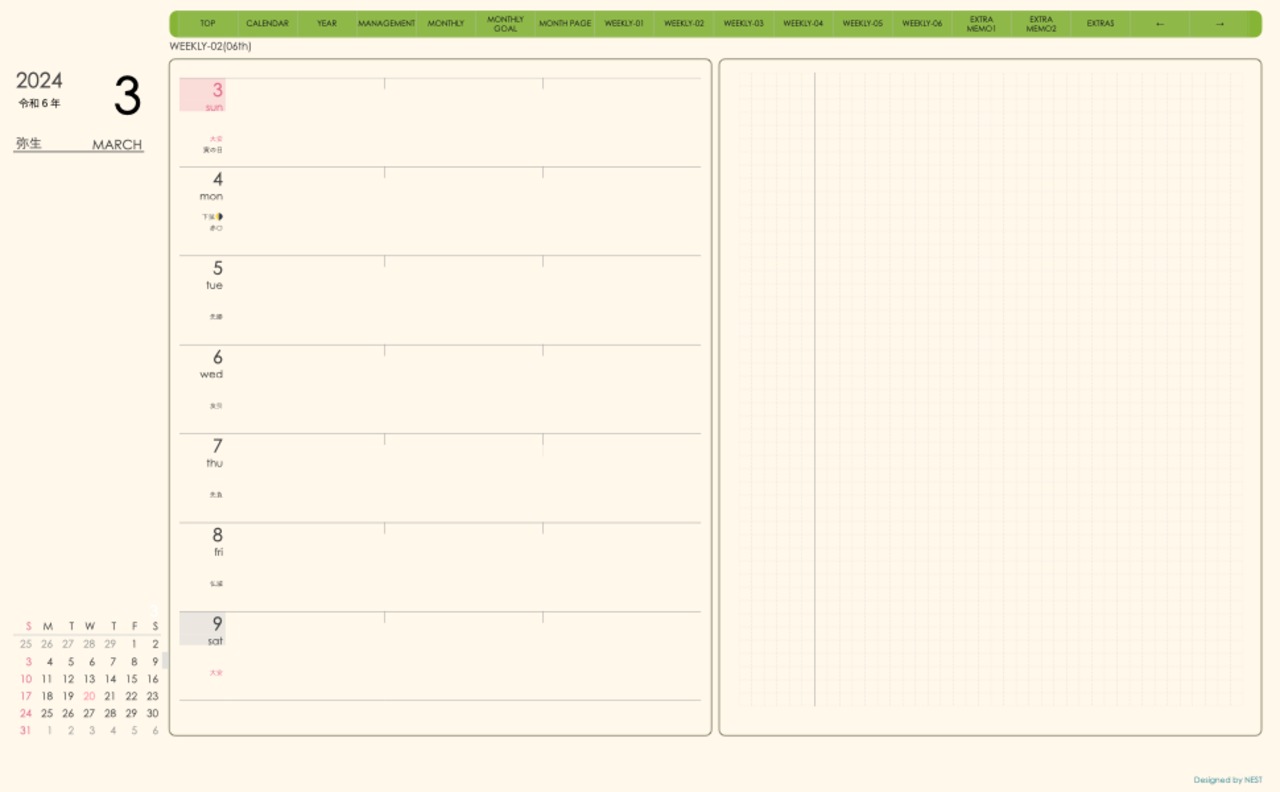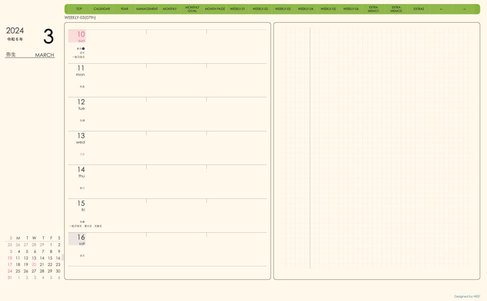 ・週間予定+メモで 左側に週間予定、右側に方眼メモという