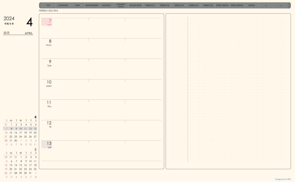 ・週間予定+メモで 左側に週間予定、右側に方眼メモという