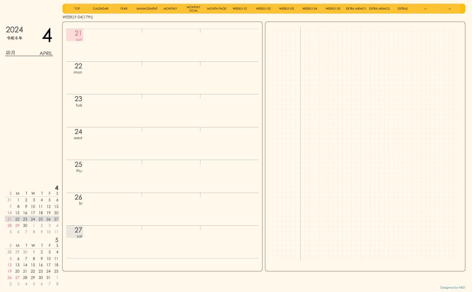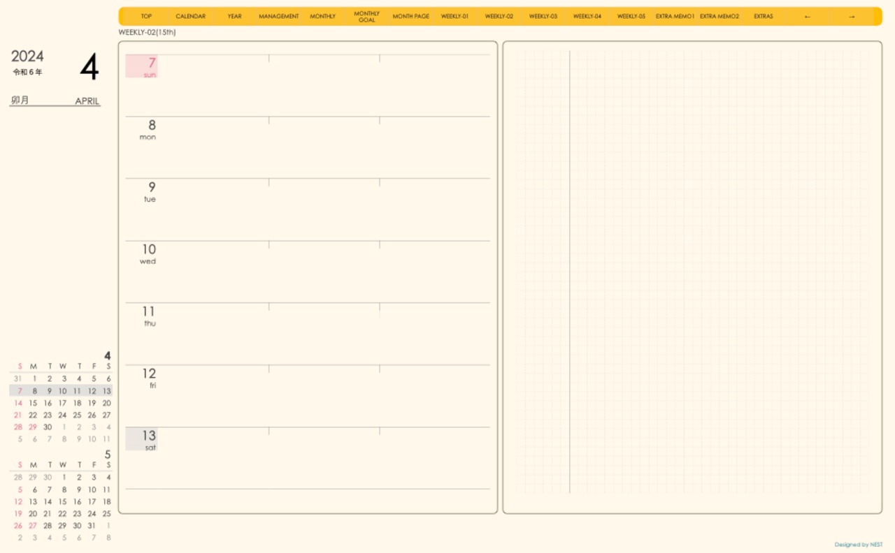 ・週間予定+メモで 左側に週間予定、右側に方眼メモという
